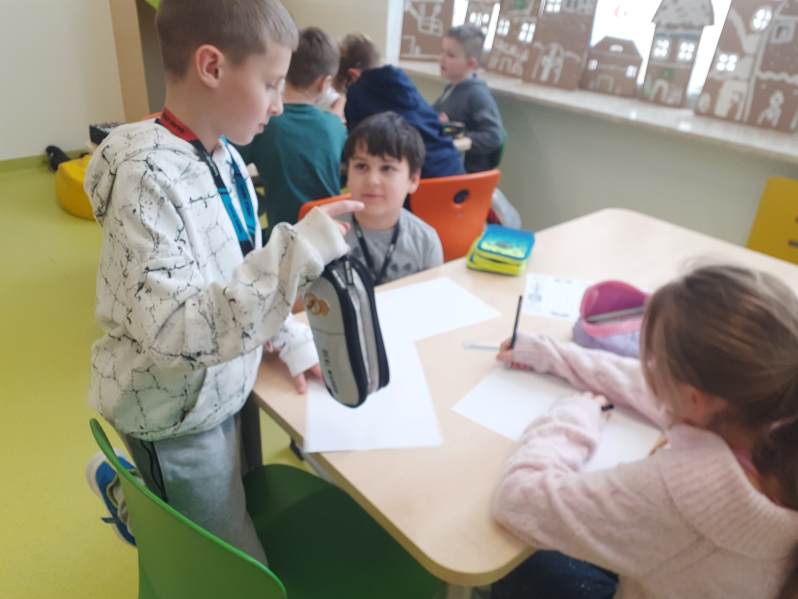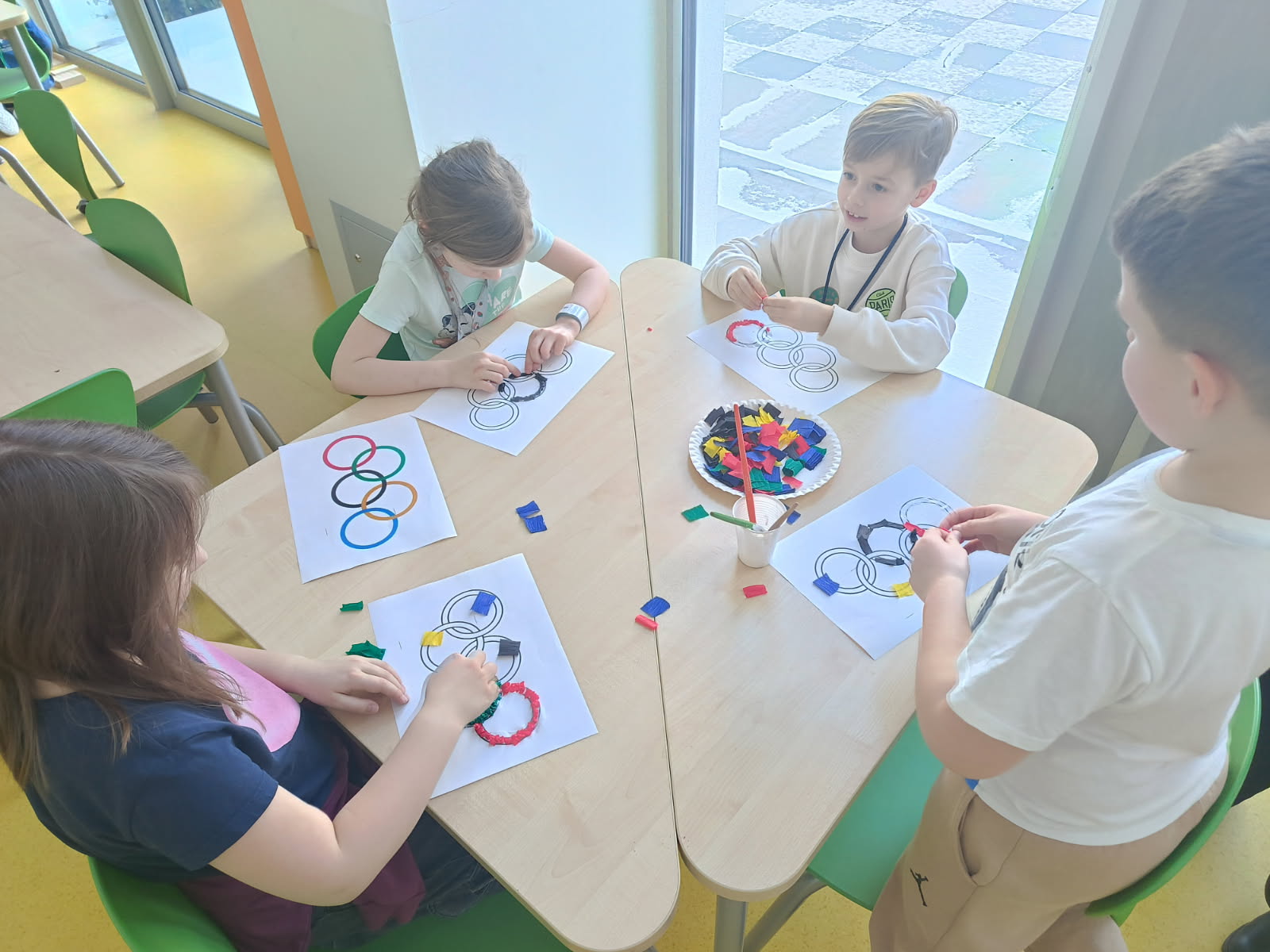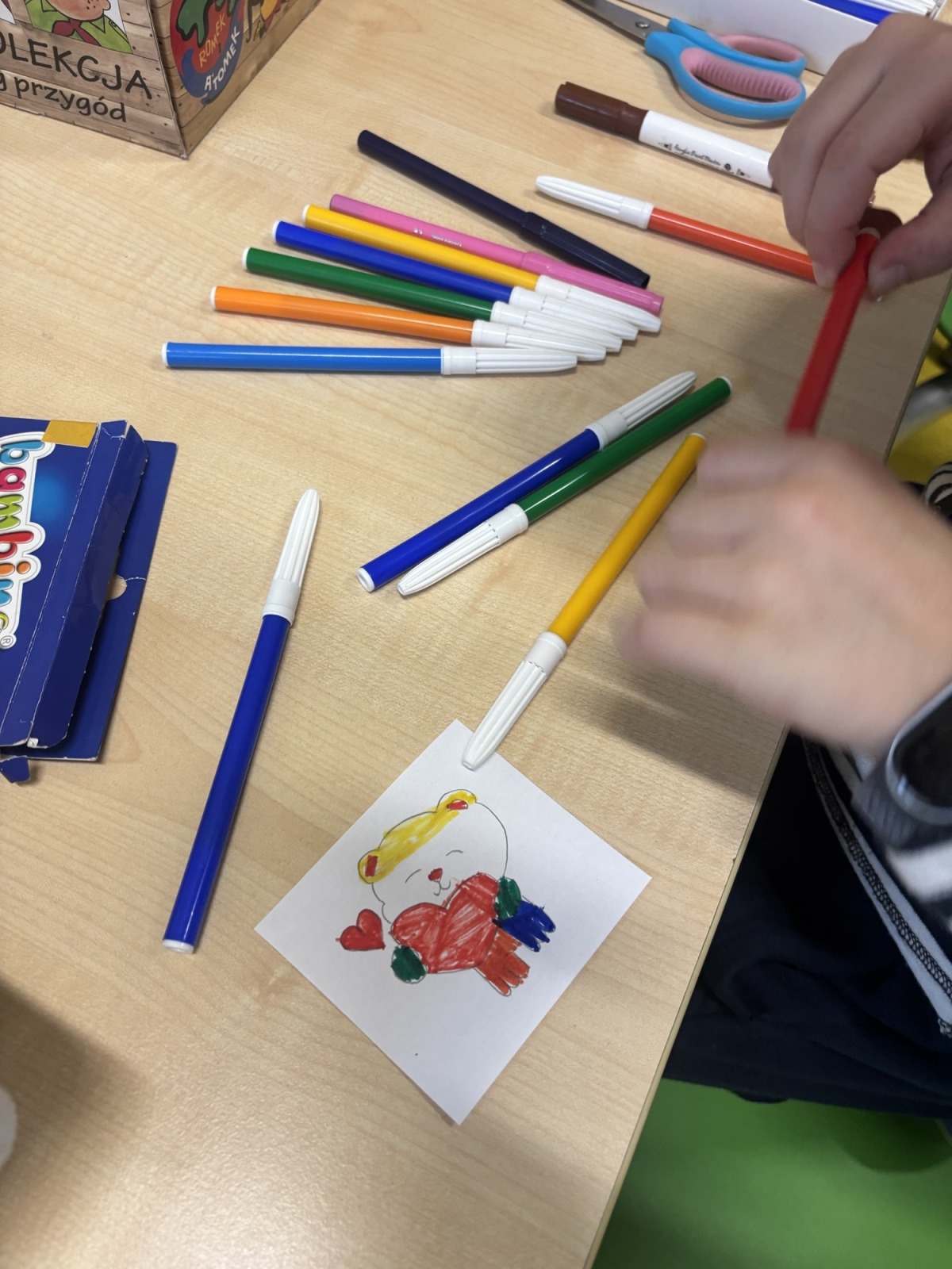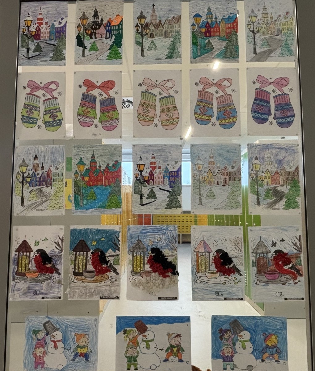 Dzieci, wypoczęte i pełne energii, wróciły po feriach do swoich wspólnych zabaw konstrukcyjnych, kreatywnych i ruchowych. Z okazji Międzynarodowego Dnia Zakochanych, obchodzonego 14 lutego, uczniowie pierwszych klas wykonali walentynki oraz wypełnili narysowane naczynie własnoręcznie przygotowanymi sercami. W lutym poznali również zimowego ptaka – gila – i ozdobili go za pomocą bibuły. Pracując w grupie, dzieci ubierały papierowe postacie na cebulkę – wycinały części garderoby, przyklejały i przyczepiały je do zimowego krajobrazu. W tym czasie, w świetlicy rozmawialiśmy m.in. o łyżwiarstwie jako jednej z dyscyplin sportów zimowych. Niektórzy pierwszoklasiści wykonali kółka olimpijskie, poznając symbolikę igrzysk olimpijskich. Część uczniów drugich klas z wyciętych z papieru i pokolorowanych łyżew utworzyła w jednej z sal ścienną gazetkę. Natomiast w związku z omawianiem tematu dotyczącego sposobów wyrażania siebie dzieci słuchały bajek terapeutycznych, próbowały przedstawić swój nastrój poprzez taniec, uczyły się uważności. W reakcji na spokojną muzykę tworzyły abstrakcyjne rysunki. Niektóre z prac przedstawiały ciszę.