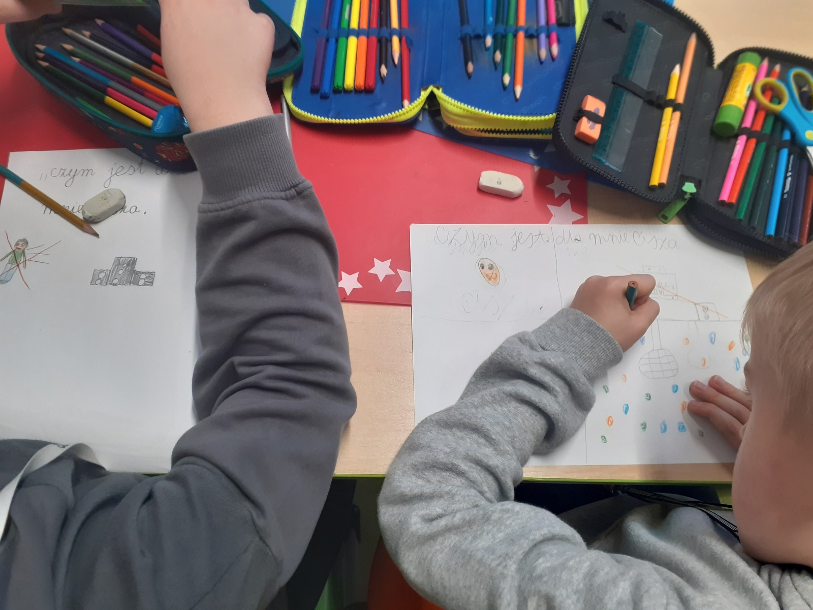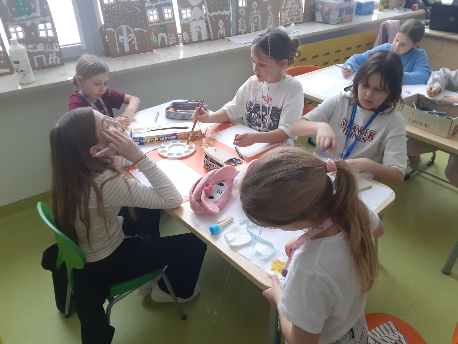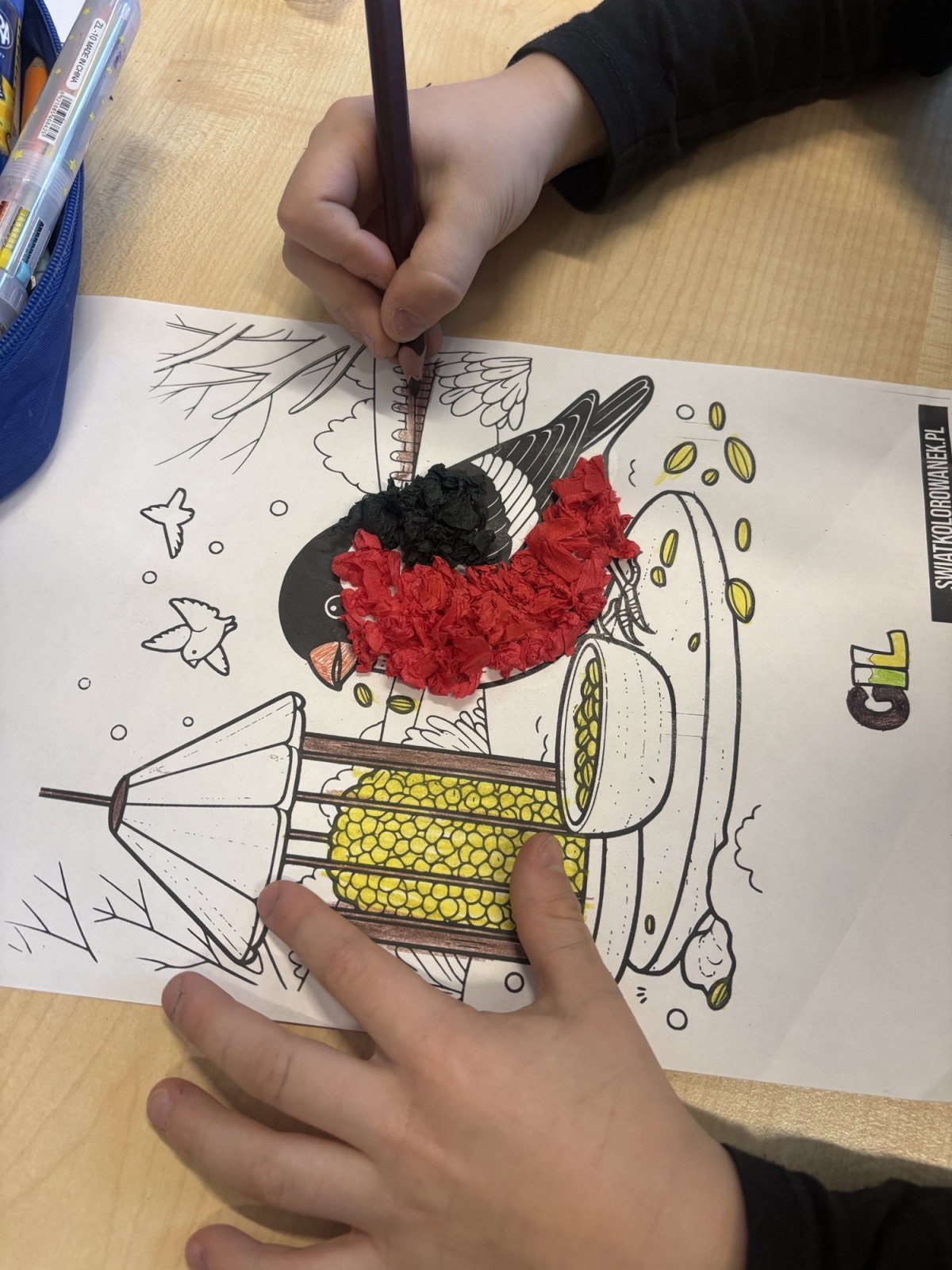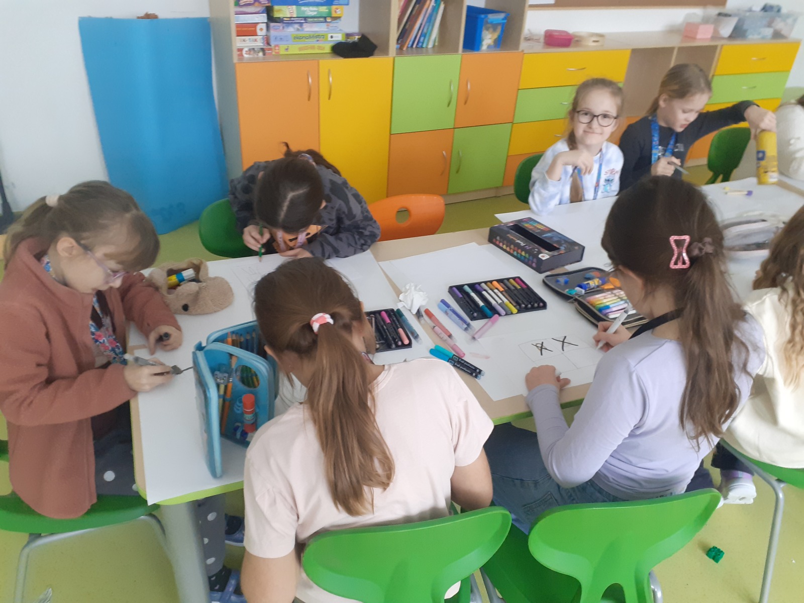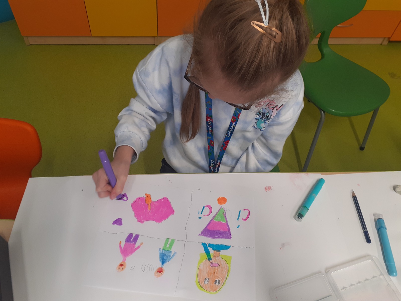 Dzieci, wypoczęte i pełne energii, wróciły po feriach do swoich wspólnych zabaw konstrukcyjnych, kreatywnych i ruchowych. Z okazji Międzynarodowego Dnia Zakochanych, obchodzonego 14 lutego, uczniowie pierwszych klas wykonali walentynki oraz wypełnili narysowane naczynie własnoręcznie przygotowanymi sercami. W lutym poznali również zimowego ptaka – gila – i ozdobili go za pomocą bibuły. Pracując w grupie, dzieci ubierały papierowe postacie na cebulkę – wycinały części garderoby, przyklejały i przyczepiały je do zimowego krajobrazu. W tym czasie, w świetlicy rozmawialiśmy m.in. o łyżwiarstwie jako jednej z dyscyplin sportów zimowych. Niektórzy pierwszoklasiści wykonali kółka olimpijskie, poznając symbolikę igrzysk olimpijskich. Część uczniów drugich klas z wyciętych z papieru i pokolorowanych łyżew utworzyła w jednej z sal ścienną gazetkę. Natomiast w związku z omawianiem tematu dotyczącego sposobów wyrażania siebie dzieci słuchały bajek terapeutycznych, próbowały przedstawić swój nastrój poprzez taniec, uczyły się uważności. W reakcji na spokojną muzykę tworzyły abstrakcyjne rysunki. Niektóre z prac przedstawiały ciszę.