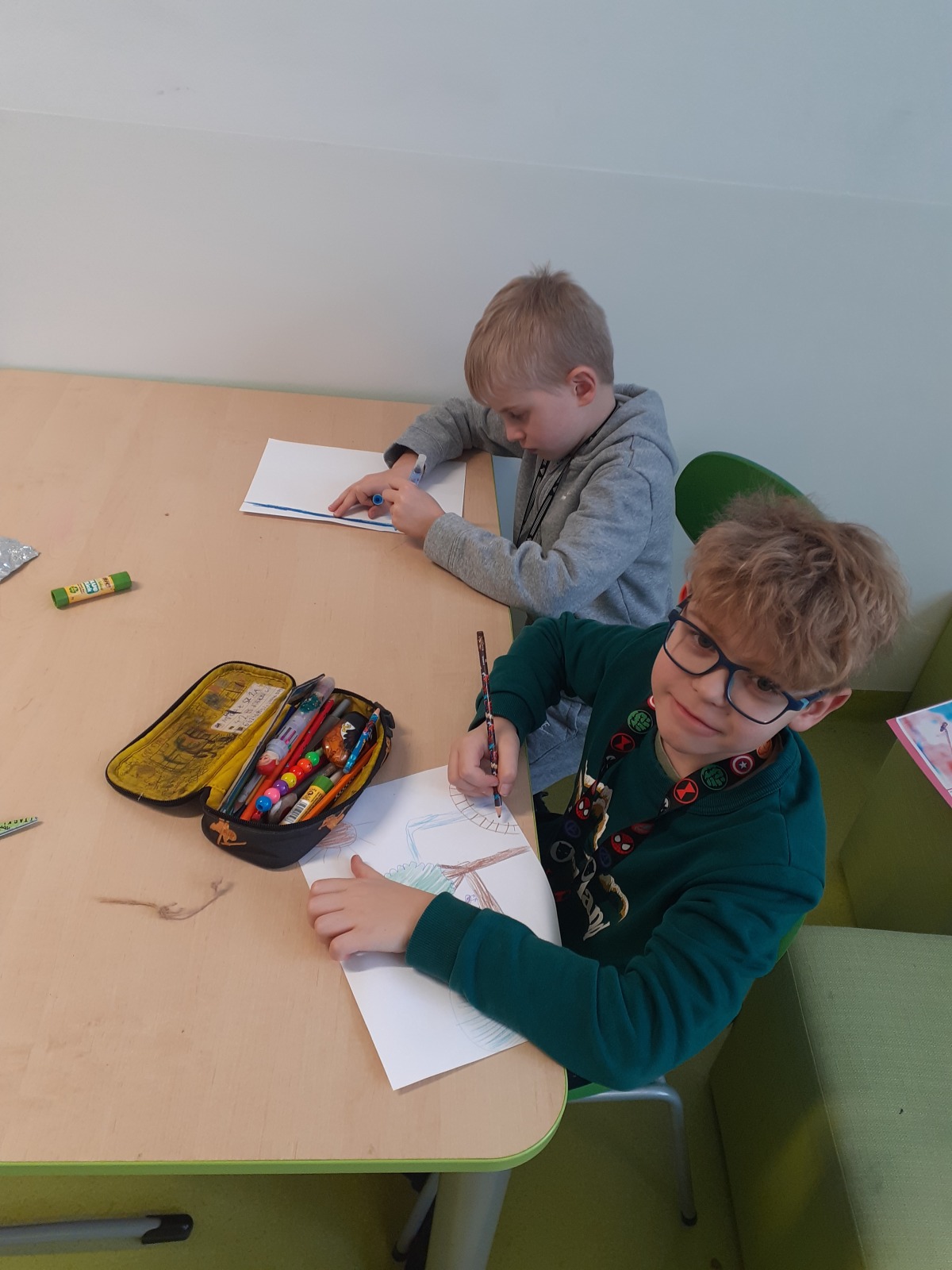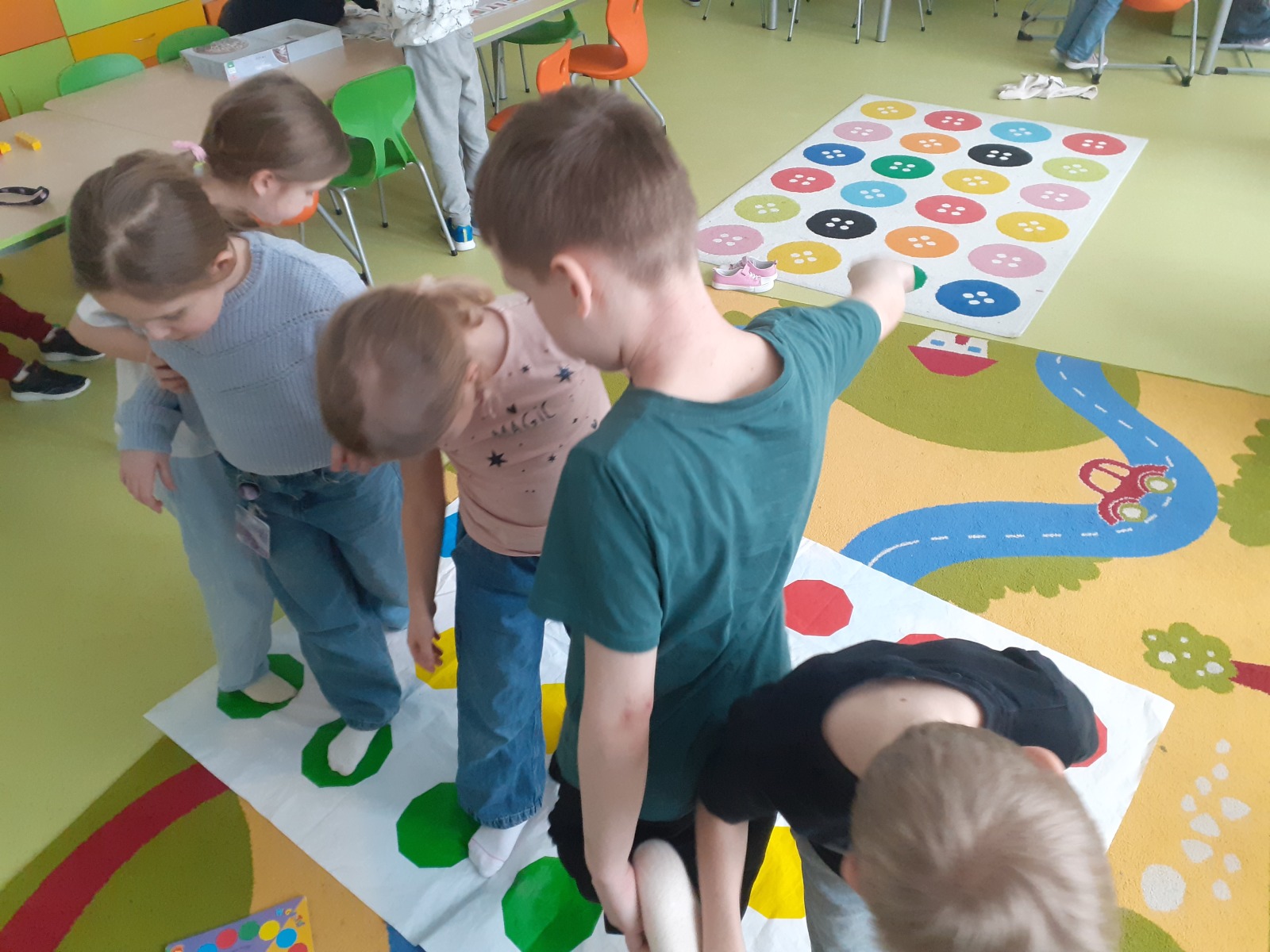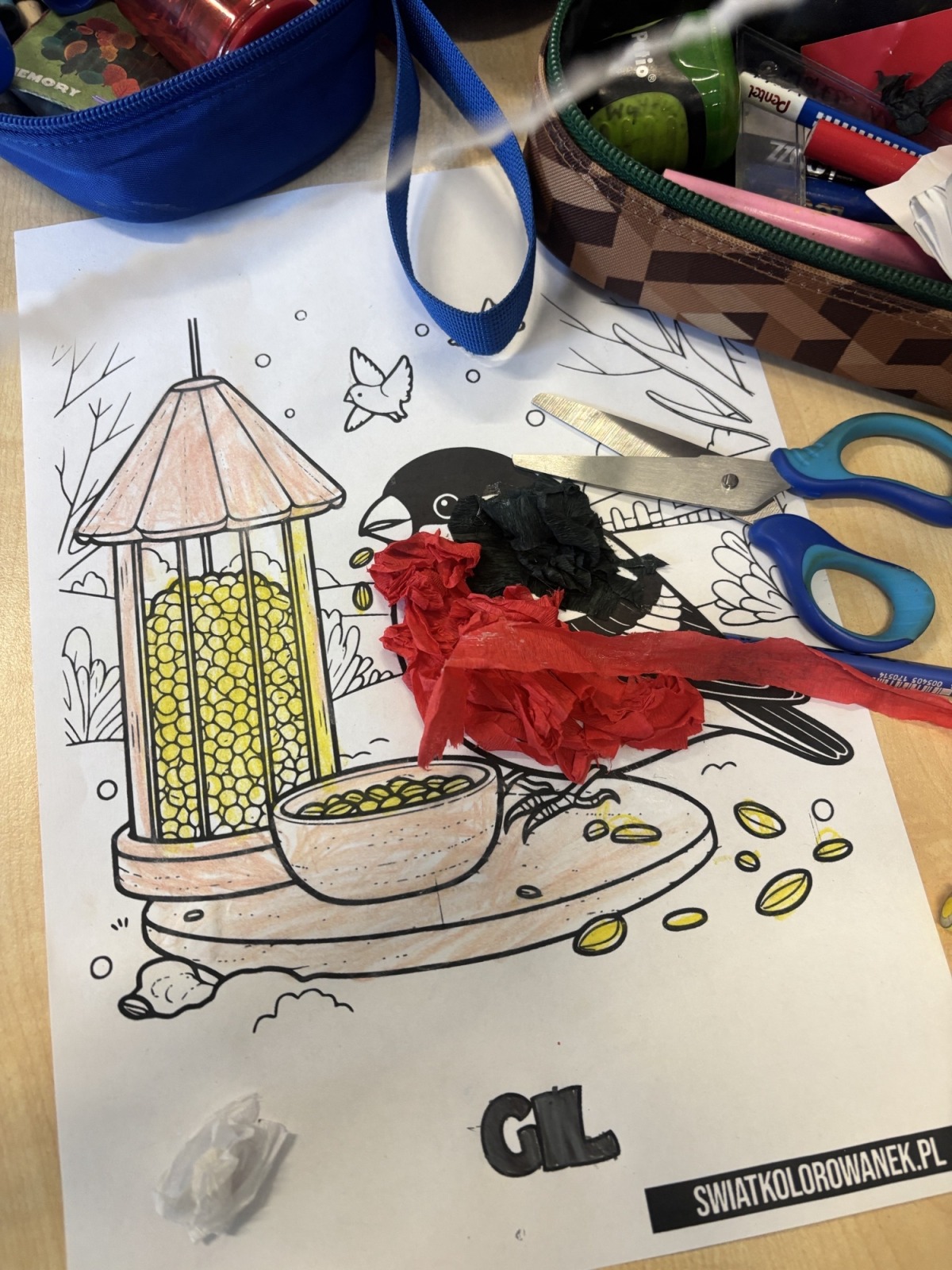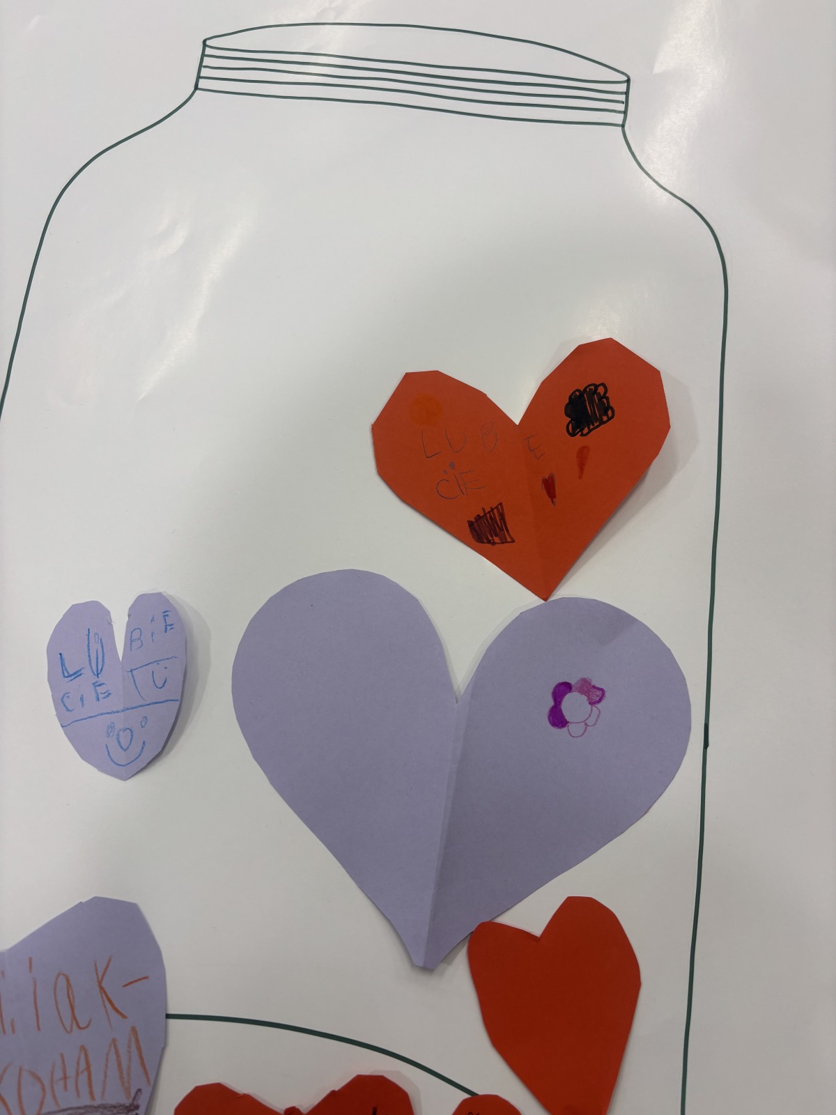 Dzieci, wypoczęte i pełne energii, wróciły po feriach do swoich wspólnych zabaw konstrukcyjnych, kreatywnych i ruchowych. Z okazji Międzynarodowego Dnia Zakochanych, obchodzonego 14 lutego, uczniowie pierwszych klas wykonali walentynki oraz wypełnili narysowane naczynie własnoręcznie przygotowanymi sercami. W lutym poznali również zimowego ptaka – gila – i ozdobili go za pomocą bibuły. Pracując w grupie, dzieci ubierały papierowe postacie na cebulkę – wycinały części garderoby, przyklejały i przyczepiały je do zimowego krajobrazu. W tym czasie, w świetlicy rozmawialiśmy m.in. o łyżwiarstwie jako jednej z dyscyplin sportów zimowych. Niektórzy pierwszoklasiści wykonali kółka olimpijskie, poznając symbolikę igrzysk olimpijskich. Część uczniów drugich klas z wyciętych z papieru i pokolorowanych łyżew utworzyła w jednej z sal ścienną gazetkę. Natomiast w związku z omawianiem tematu dotyczącego sposobów wyrażania siebie dzieci słuchały bajek terapeutycznych, próbowały przedstawić swój nastrój poprzez taniec, uczyły się uważności. W reakcji na spokojną muzykę tworzyły abstrakcyjne rysunki. Niektóre z prac przedstawiały ciszę.