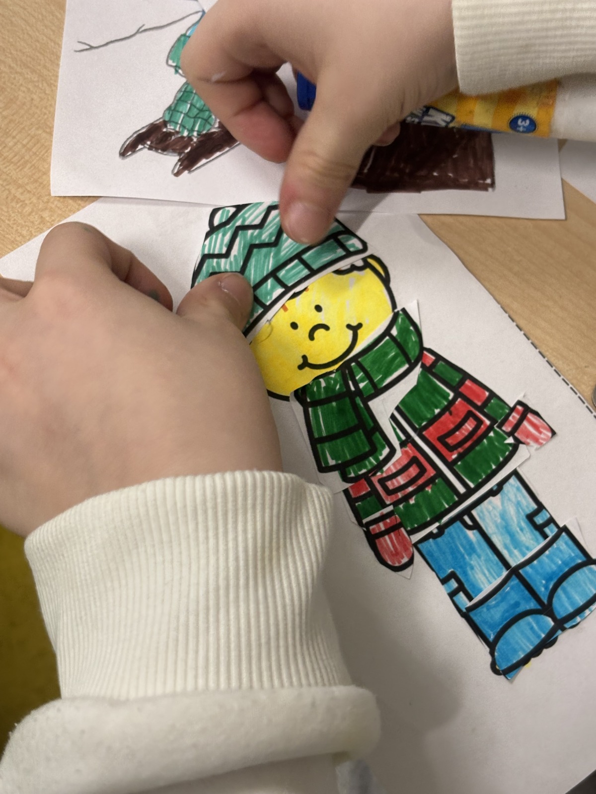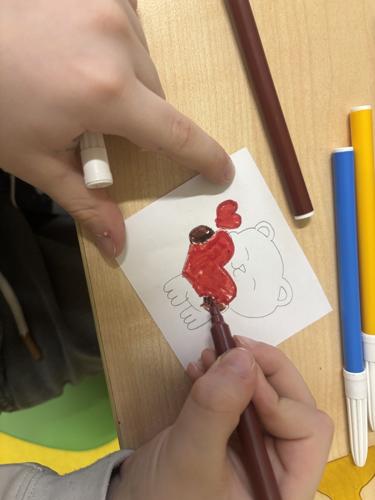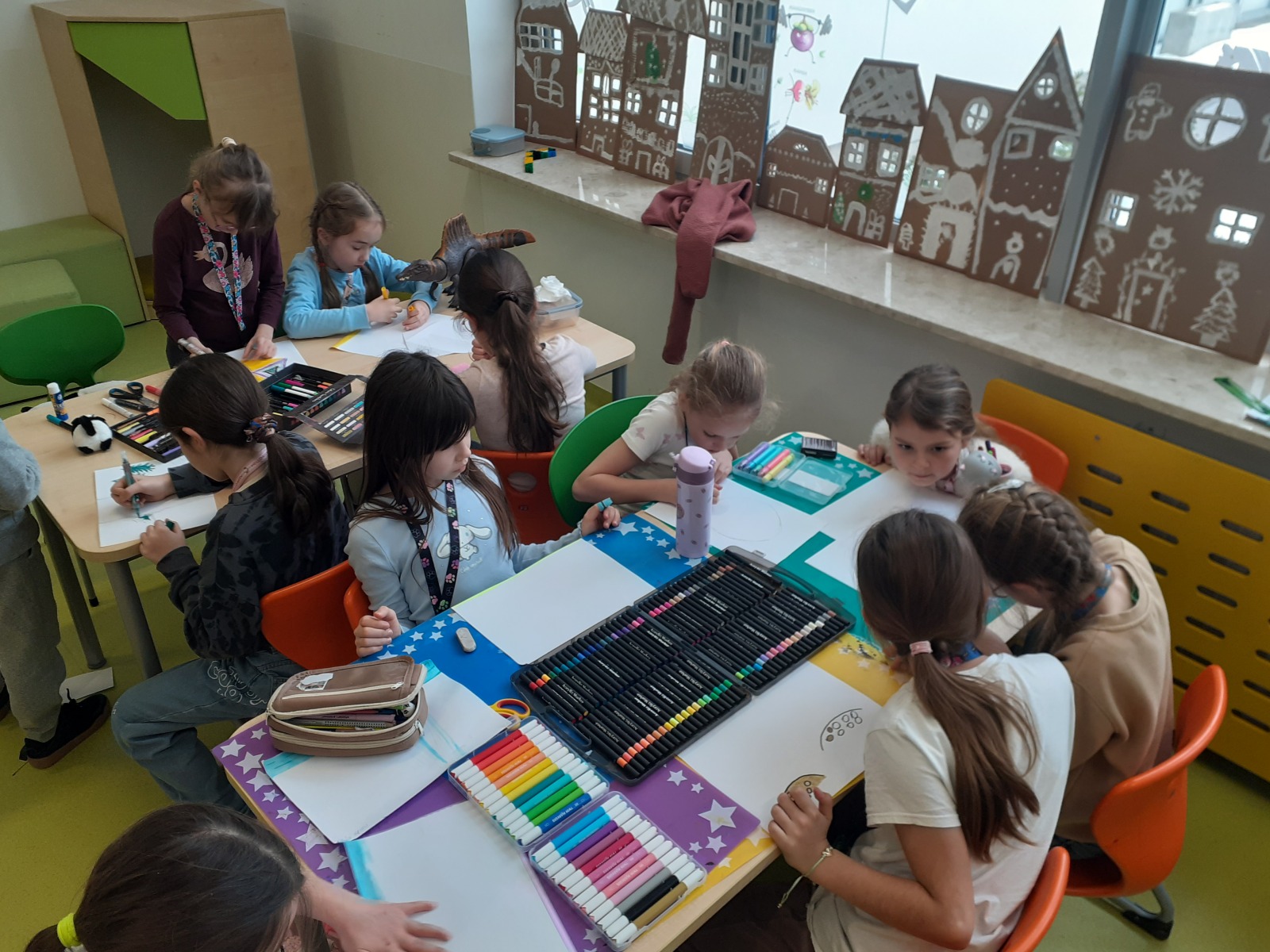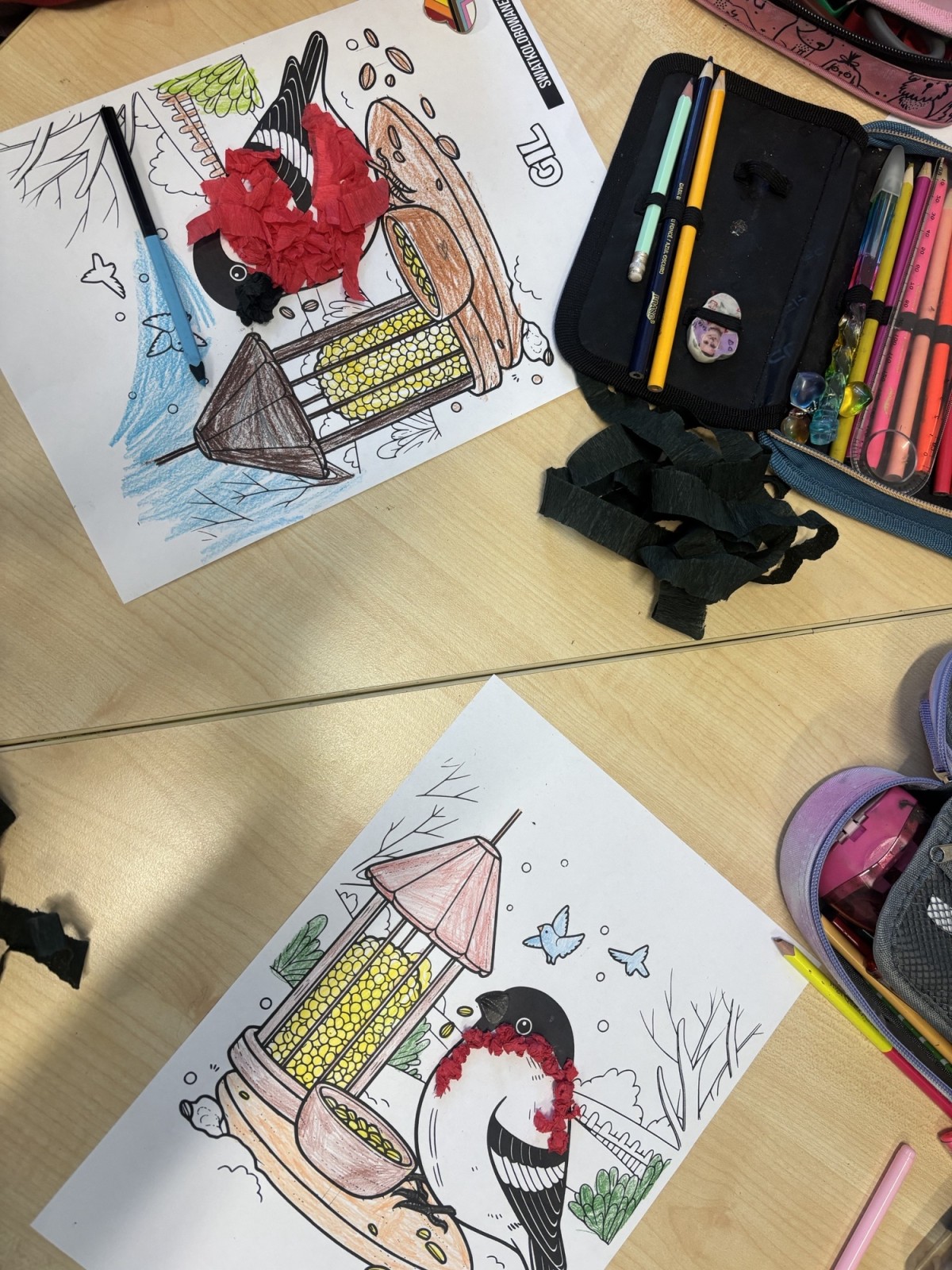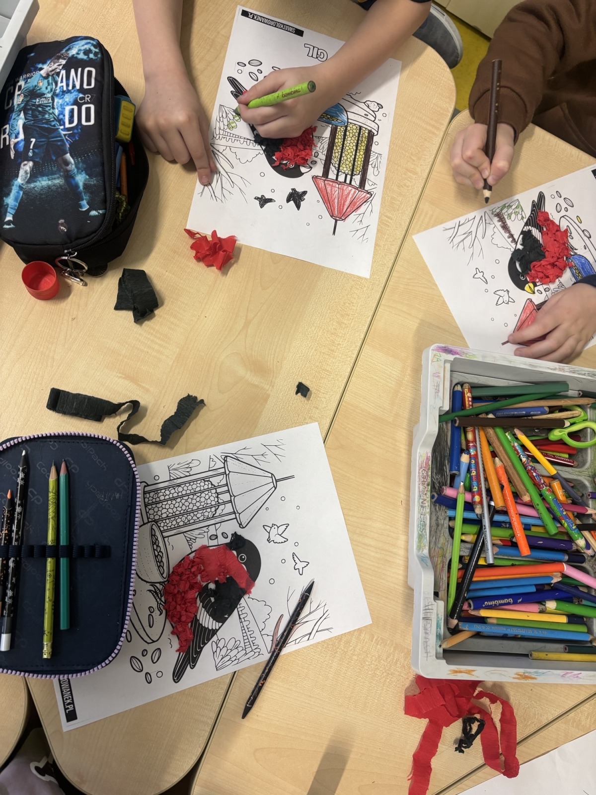 Dzieci, wypoczęte i pełne energii, wróciły po feriach do swoich wspólnych zabaw konstrukcyjnych, kreatywnych i ruchowych. Z okazji Międzynarodowego Dnia Zakochanych, obchodzonego 14 lutego, uczniowie pierwszych klas wykonali walentynki oraz wypełnili narysowane naczynie własnoręcznie przygotowanymi sercami. W lutym poznali również zimowego ptaka – gila – i ozdobili go za pomocą bibuły. Pracując w grupie, dzieci ubierały papierowe postacie na cebulkę – wycinały części garderoby, przyklejały i przyczepiały je do zimowego krajobrazu. W tym czasie, w świetlicy rozmawialiśmy m.in. o łyżwiarstwie jako jednej z dyscyplin sportów zimowych. Niektórzy pierwszoklasiści wykonali kółka olimpijskie, poznając symbolikę igrzysk olimpijskich. Część uczniów drugich klas z wyciętych z papieru i pokolorowanych łyżew utworzyła w jednej z sal ścienną gazetkę. Natomiast w związku z omawianiem tematu dotyczącego sposobów wyrażania siebie dzieci słuchały bajek terapeutycznych, próbowały przedstawić swój nastrój poprzez taniec, uczyły się uważności. W reakcji na spokojną muzykę tworzyły abstrakcyjne rysunki. Niektóre z prac przedstawiały ciszę.