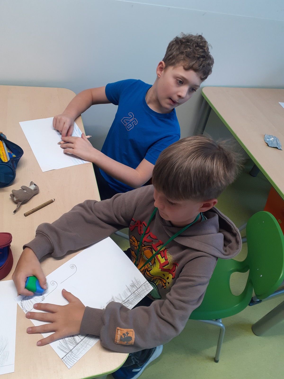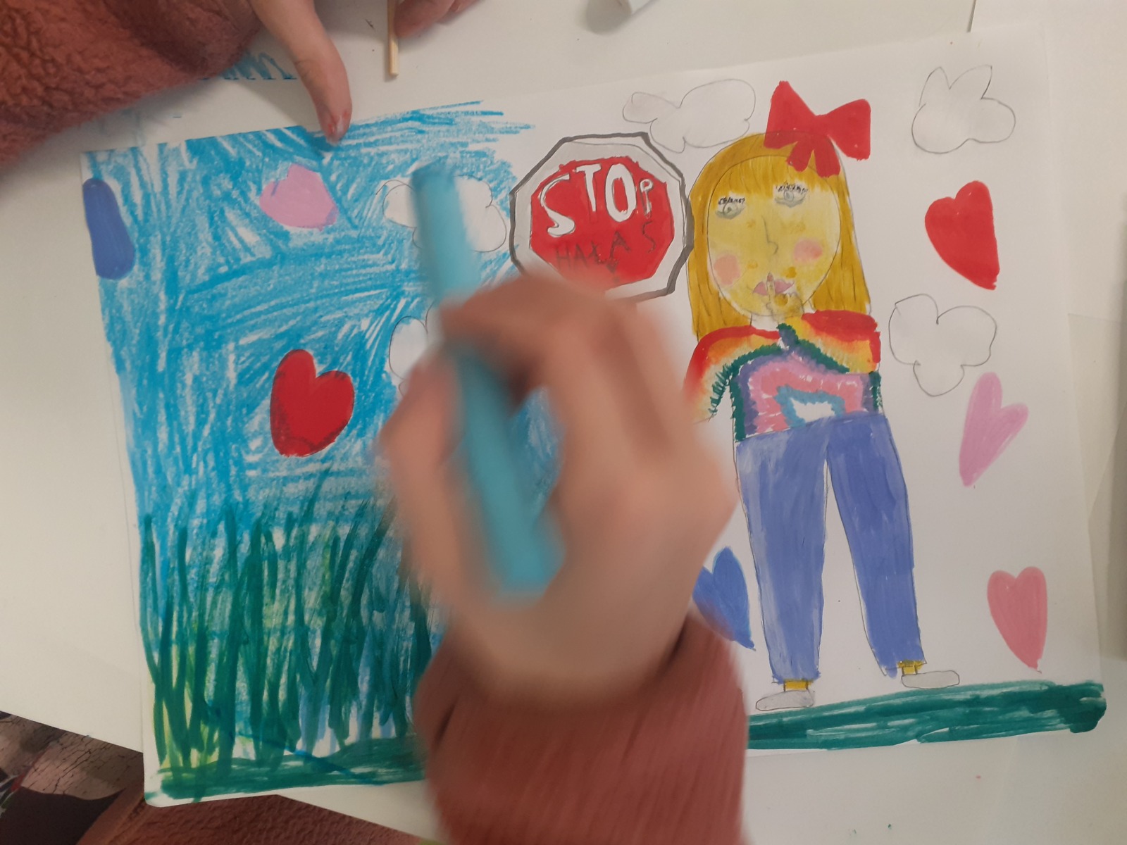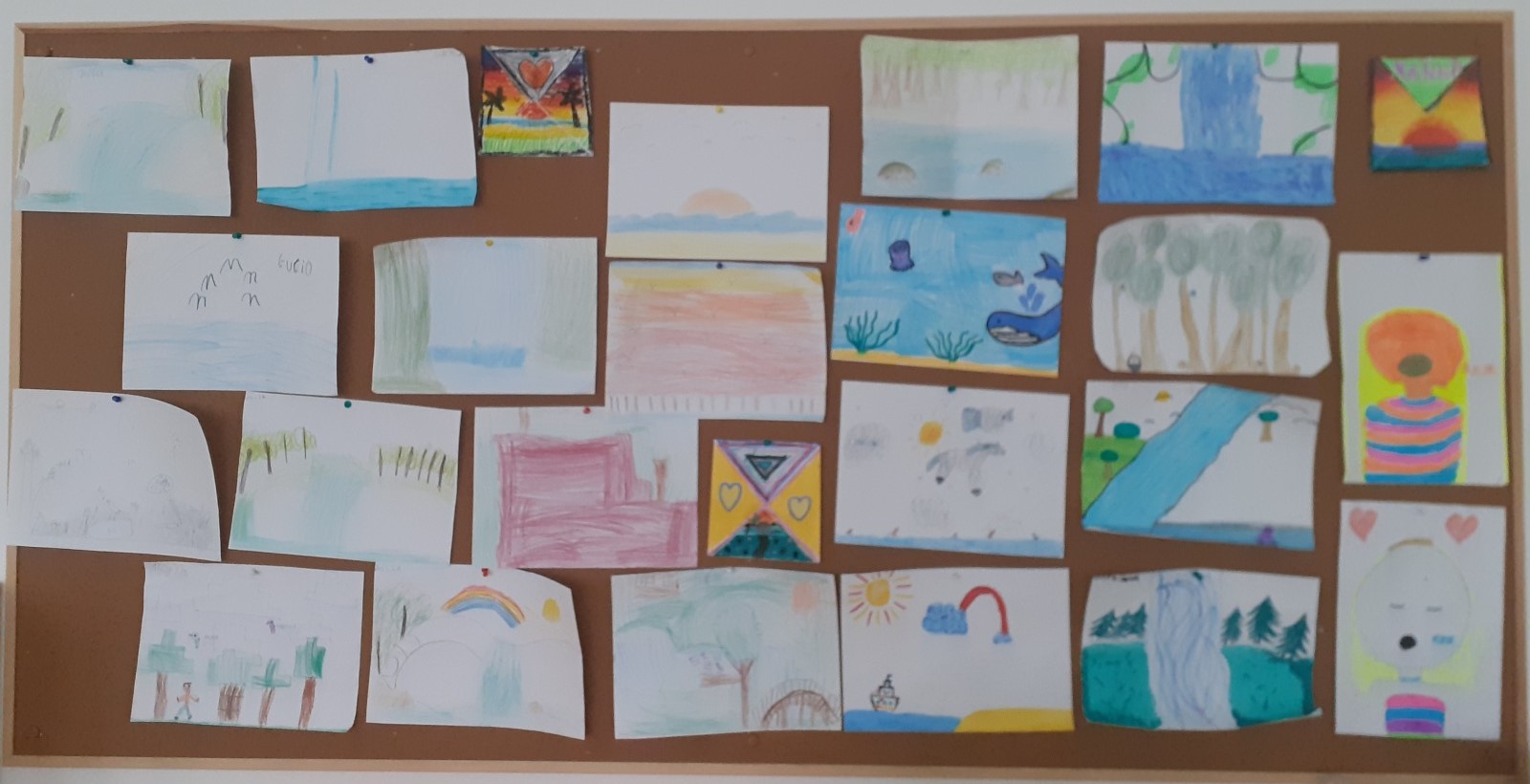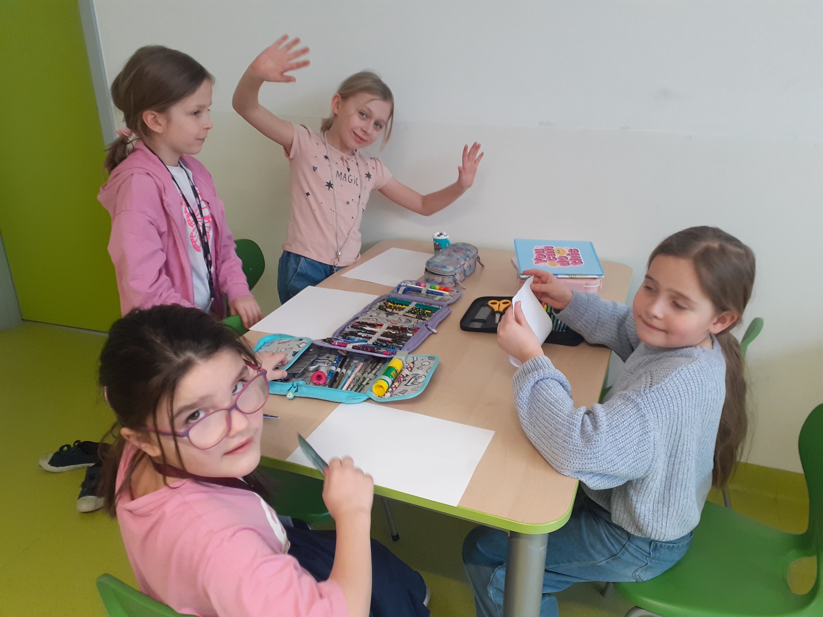 Dzieci, wypoczęte i pełne energii, wróciły po feriach do swoich wspólnych zabaw konstrukcyjnych, kreatywnych i ruchowych. Z okazji Międzynarodowego Dnia Zakochanych, obchodzonego 14 lutego, uczniowie pierwszych klas wykonali walentynki oraz wypełnili narysowane naczynie własnoręcznie przygotowanymi sercami. W lutym poznali również zimowego ptaka – gila – i ozdobili go za pomocą bibuły. Pracując w grupie, dzieci ubierały papierowe postacie na cebulkę – wycinały części garderoby, przyklejały i przyczepiały je do zimowego krajobrazu. W tym czasie, w świetlicy rozmawialiśmy m.in. o łyżwiarstwie jako jednej z dyscyplin sportów zimowych. Niektórzy pierwszoklasiści wykonali kółka olimpijskie, poznając symbolikę igrzysk olimpijskich. Część uczniów drugich klas z wyciętych z papieru i pokolorowanych łyżew utworzyła w jednej z sal ścienną gazetkę. Natomiast w związku z omawianiem tematu dotyczącego sposobów wyrażania siebie dzieci słuchały bajek terapeutycznych, próbowały przedstawić swój nastrój poprzez taniec, uczyły się uważności. W reakcji na spokojną muzykę tworzyły abstrakcyjne rysunki. Niektóre z prac przedstawiały ciszę.