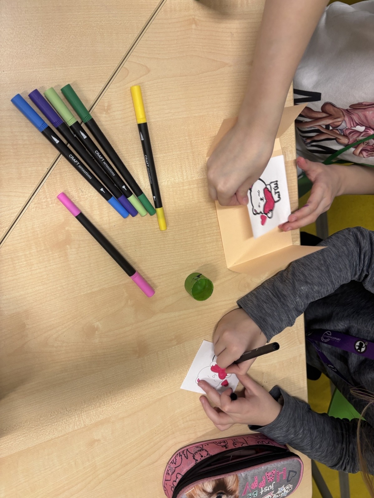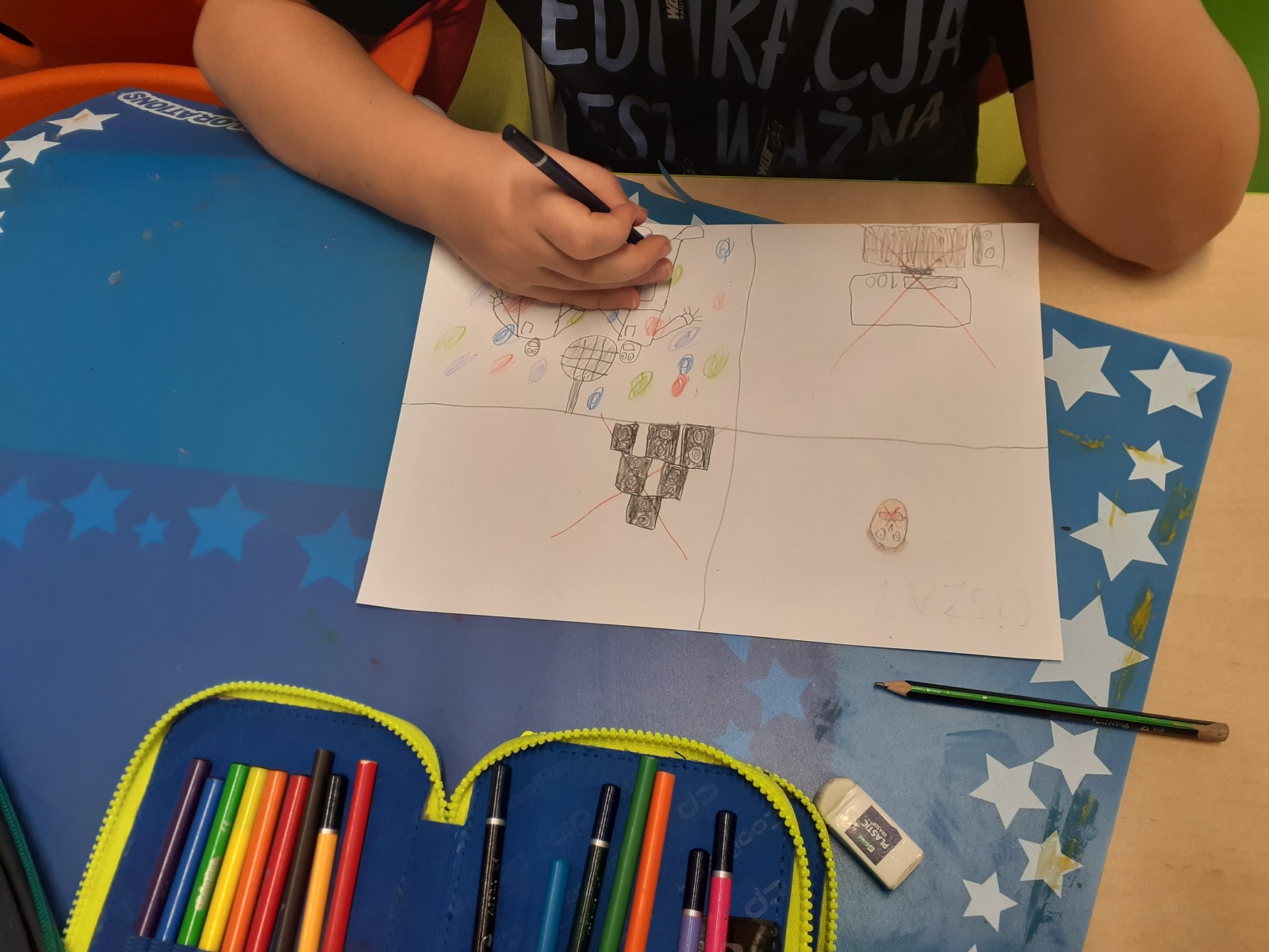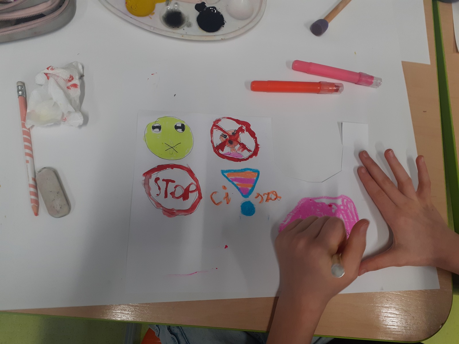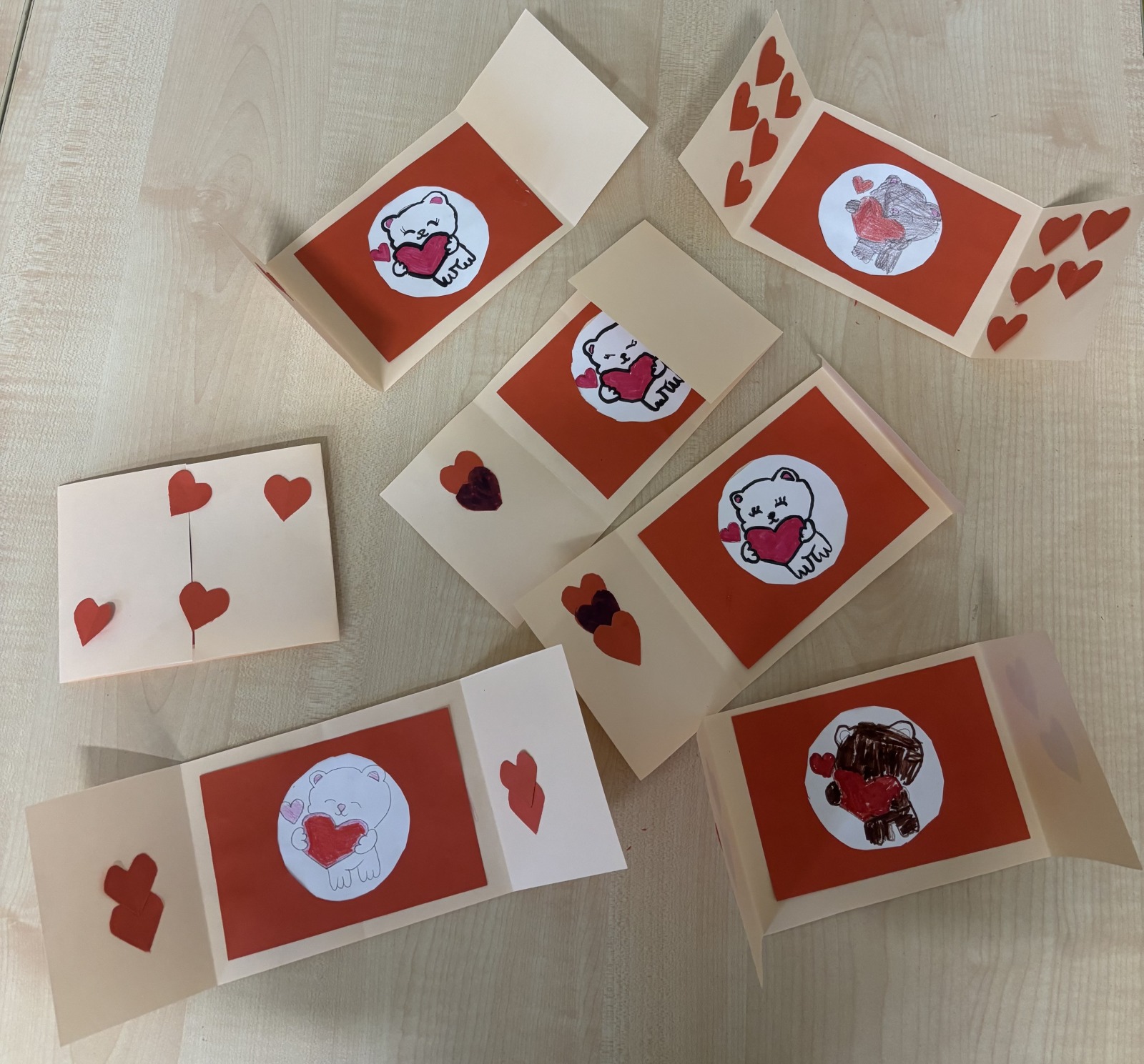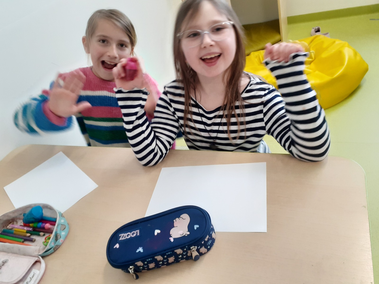Dzieci, wypoczęte i pełne energii, wróciły po feriach do swoich wspólnych zabaw konstrukcyjnych, kreatywnych i ruchowych. Z okazji Międzynarodowego Dnia Zakochanych, obchodzonego 14 lutego, uczniowie pierwszych klas wykonali walentynki oraz wypełnili narysowane naczynie własnoręcznie przygotowanymi sercami. W lutym poznali również zimowego ptaka – gila – i ozdobili go za pomocą bibuły. Pracując w grupie, dzieci ubierały papierowe postacie na cebulkę – wycinały części garderoby, przyklejały i przyczepiały je do zimowego krajobrazu. W tym czasie, w świetlicy rozmawialiśmy m.in. o łyżwiarstwie jako jednej z dyscyplin sportów zimowych. Niektórzy pierwszoklasiści wykonali kółka olimpijskie, poznając symbolikę igrzysk olimpijskich. Część uczniów drugich klas z wyciętych z papieru i pokolorowanych łyżew utworzyła w jednej z sal ścienną gazetkę. Natomiast w związku z omawianiem tematu dotyczącego sposobów wyrażania siebie dzieci słuchały bajek terapeutycznych, próbowały przedstawić swój nastrój poprzez taniec, uczyły się uważności. W reakcji na spokojną muzykę tworzyły abstrakcyjne rysunki. Niektóre z prac przedstawiały ciszę.