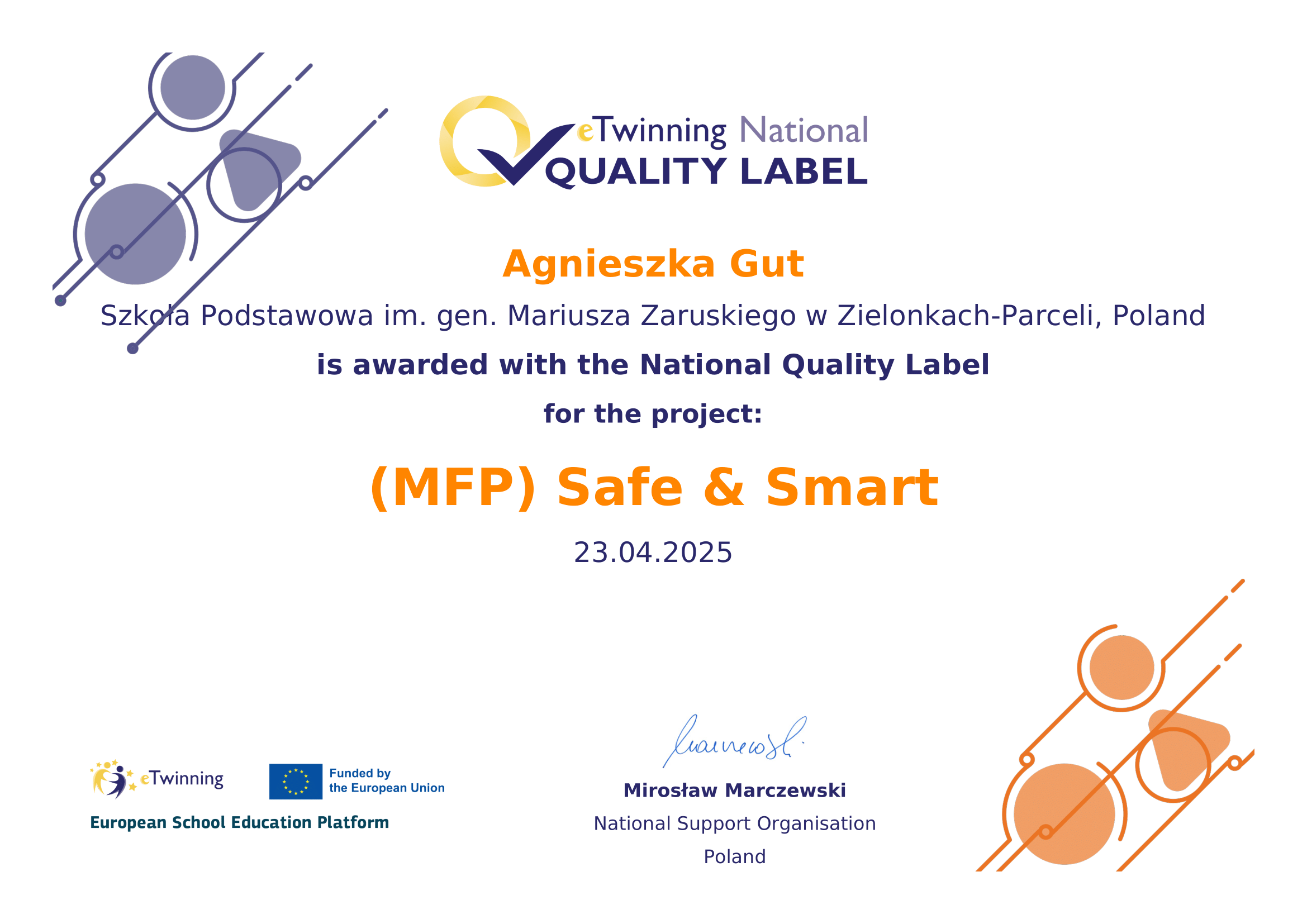 - Projekt „Safe and Smart” (01-04.2025 r.) realizowany przez uczniów klasy 4 we współpracy interdyscyplinarnej nauczycieli języka angielskiego i informatyki (Agnieszka Gut, Krzysztof Iwanowski).