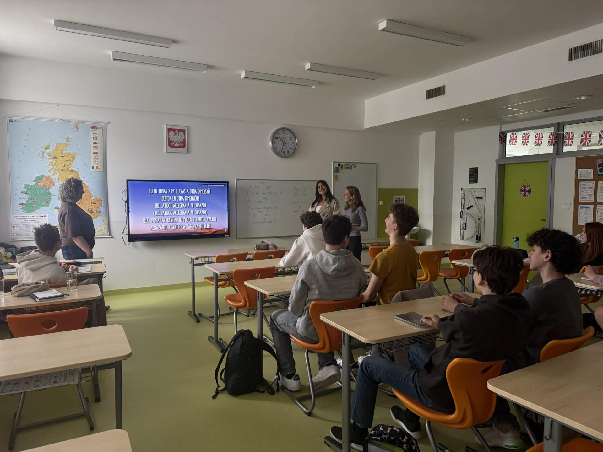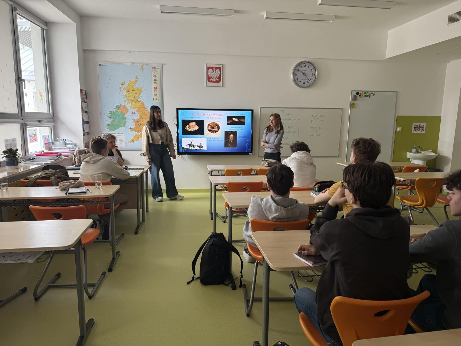 W ostatnich dniach gościliśmy w naszej szkole dwie nauczycielki z Madrytu, które przyjechały w ramach współpracy międzynarodowej. Pierwszego dnia odbyły spotkanie z Dyrekcją, zostały oprowadzone po budynku szkoły oraz uczestniczyły w lekcji języka hiszpańskiego. Podczas zajęć opowiedziały uczniom o swoim kraju – tradycjach, zwyczajach i kulturze. W kolejnych dniach obserwowały lekcje prowadzone przez naszych nauczycieli, wymieniały się doświadczeniami, poznawały metody pracy oraz codzienne życie szkolne.