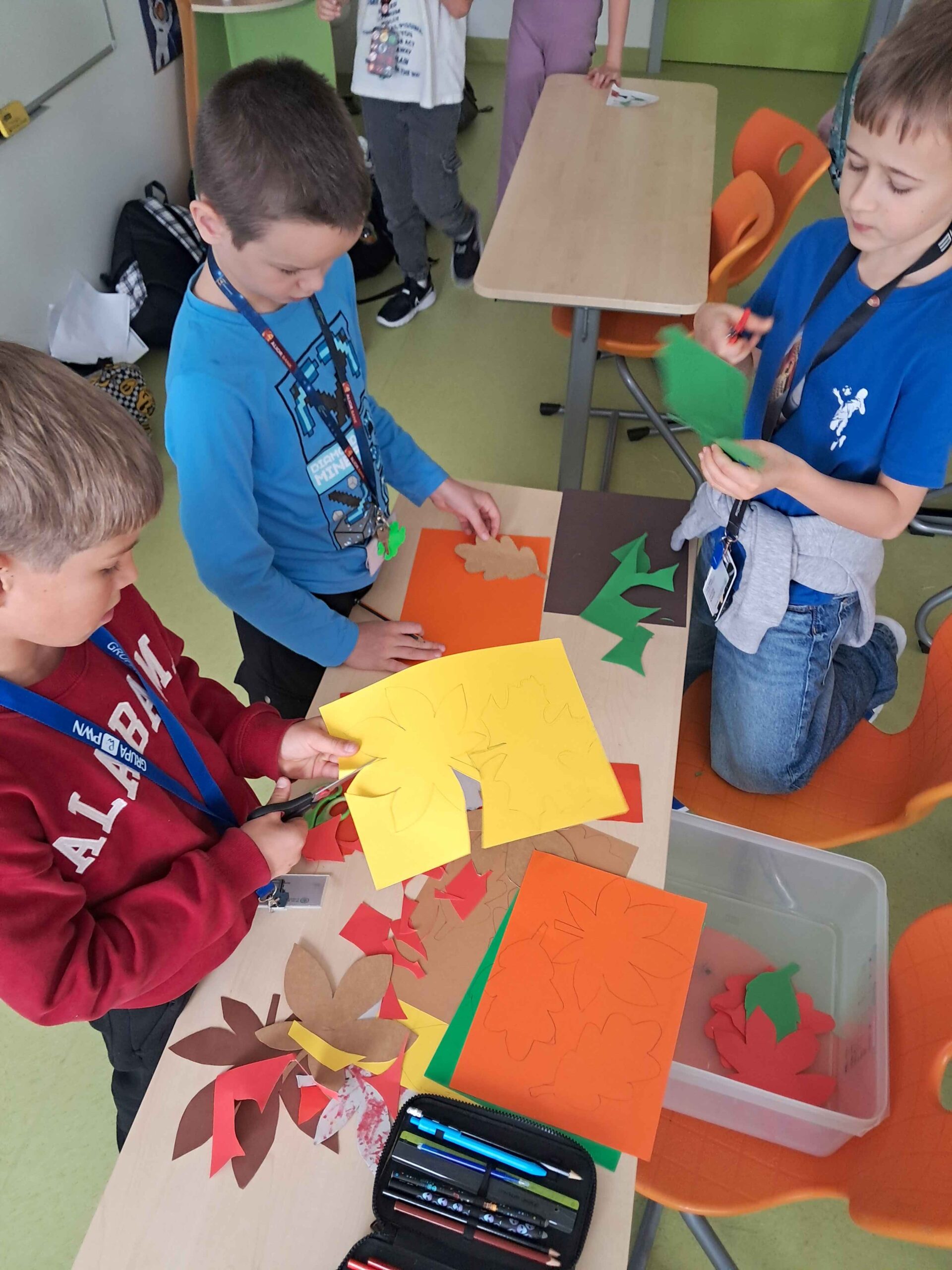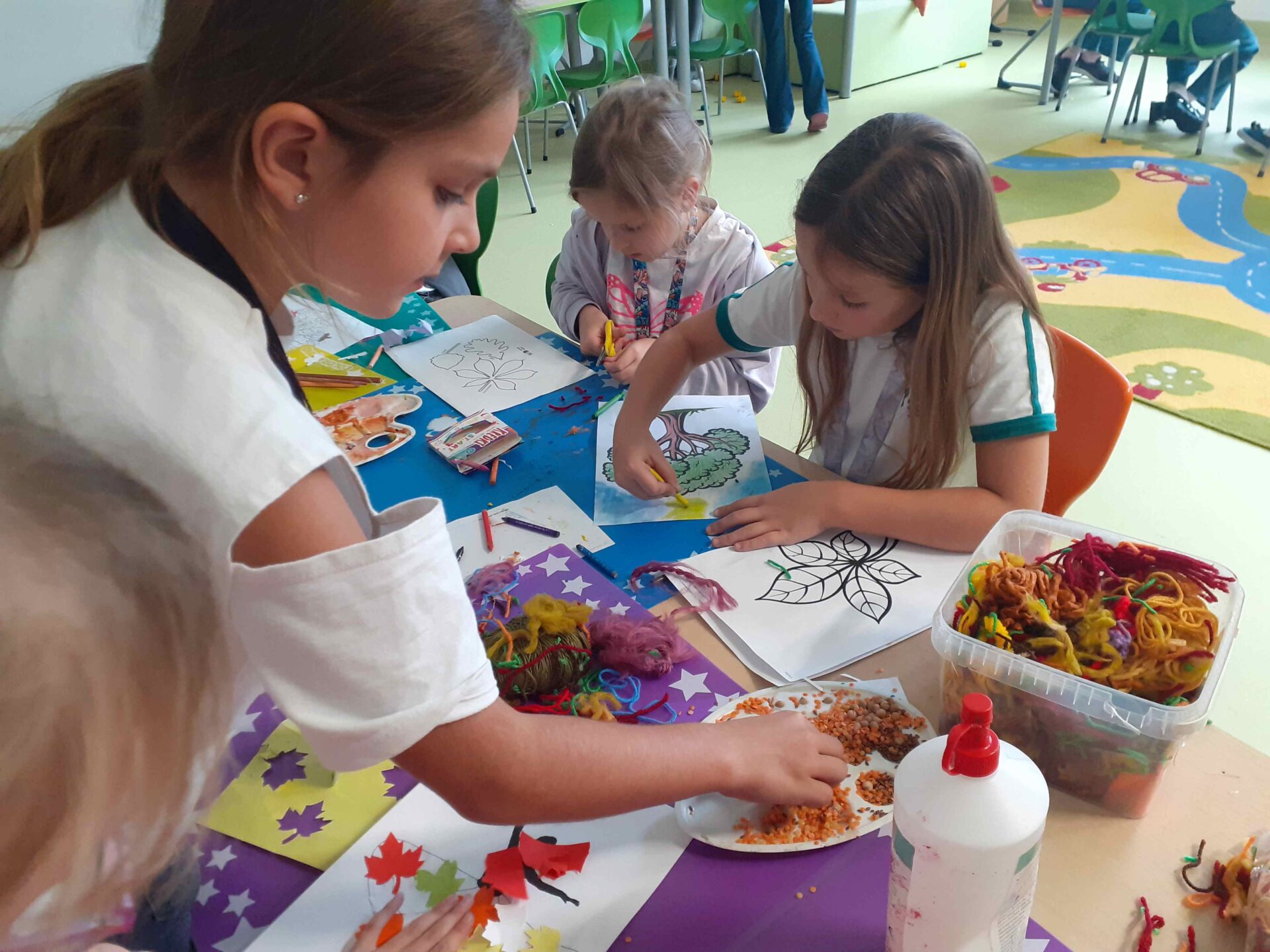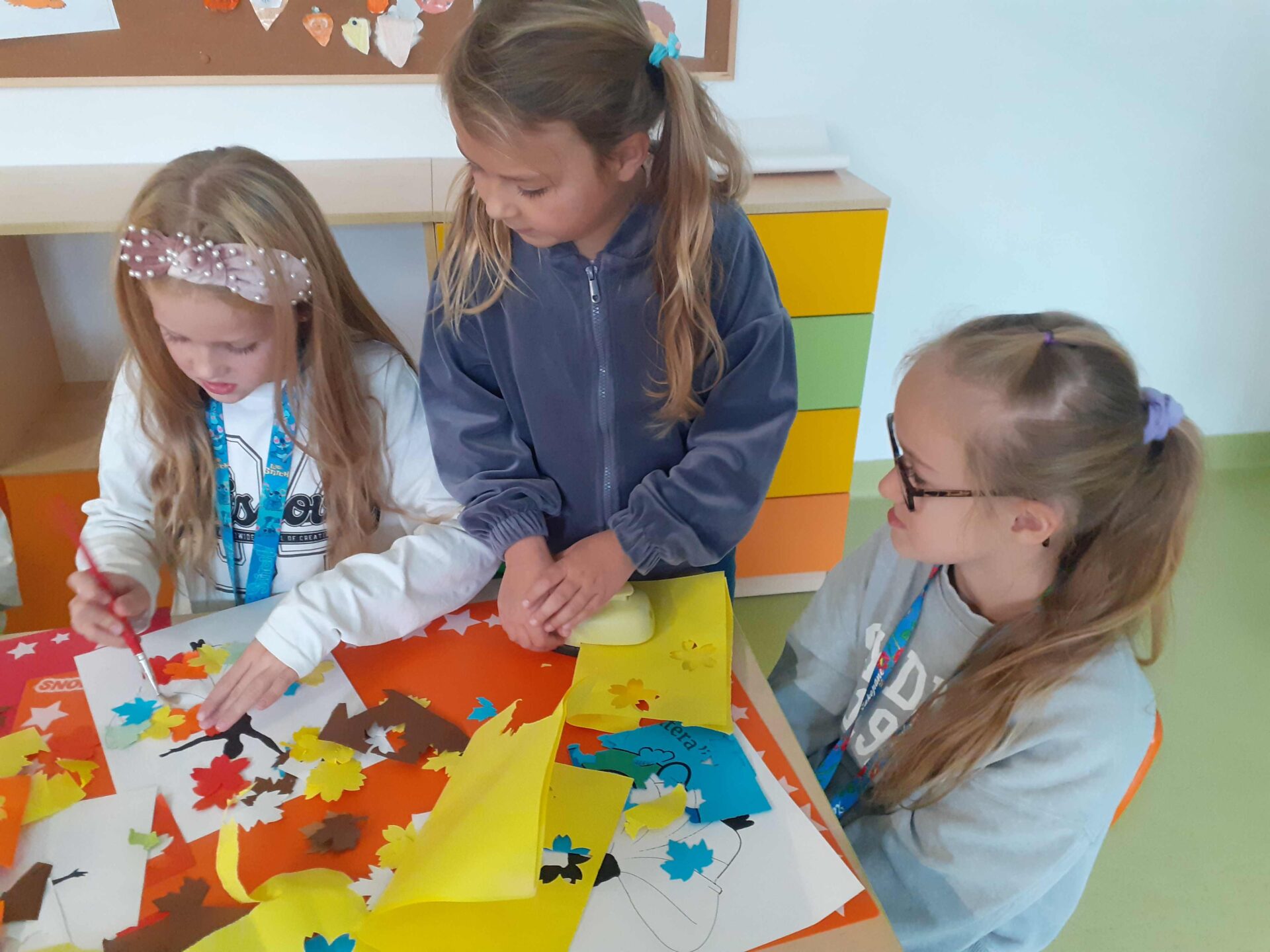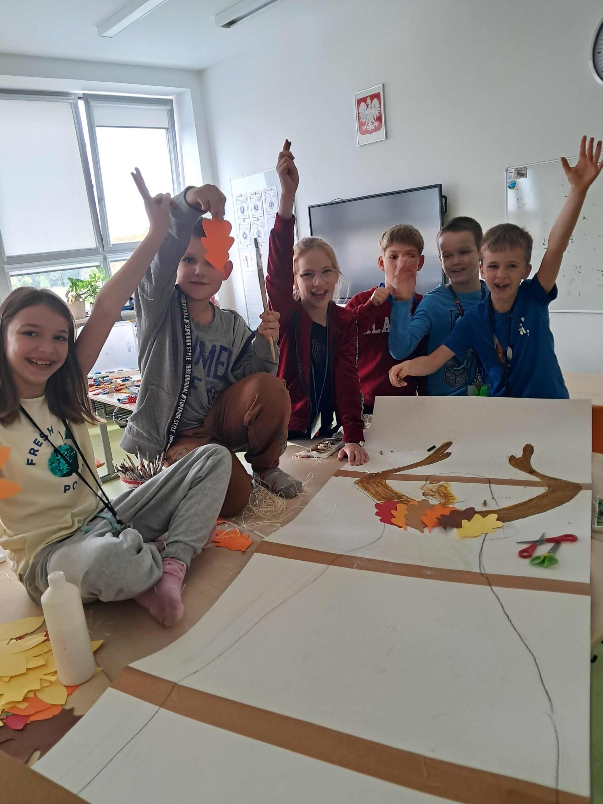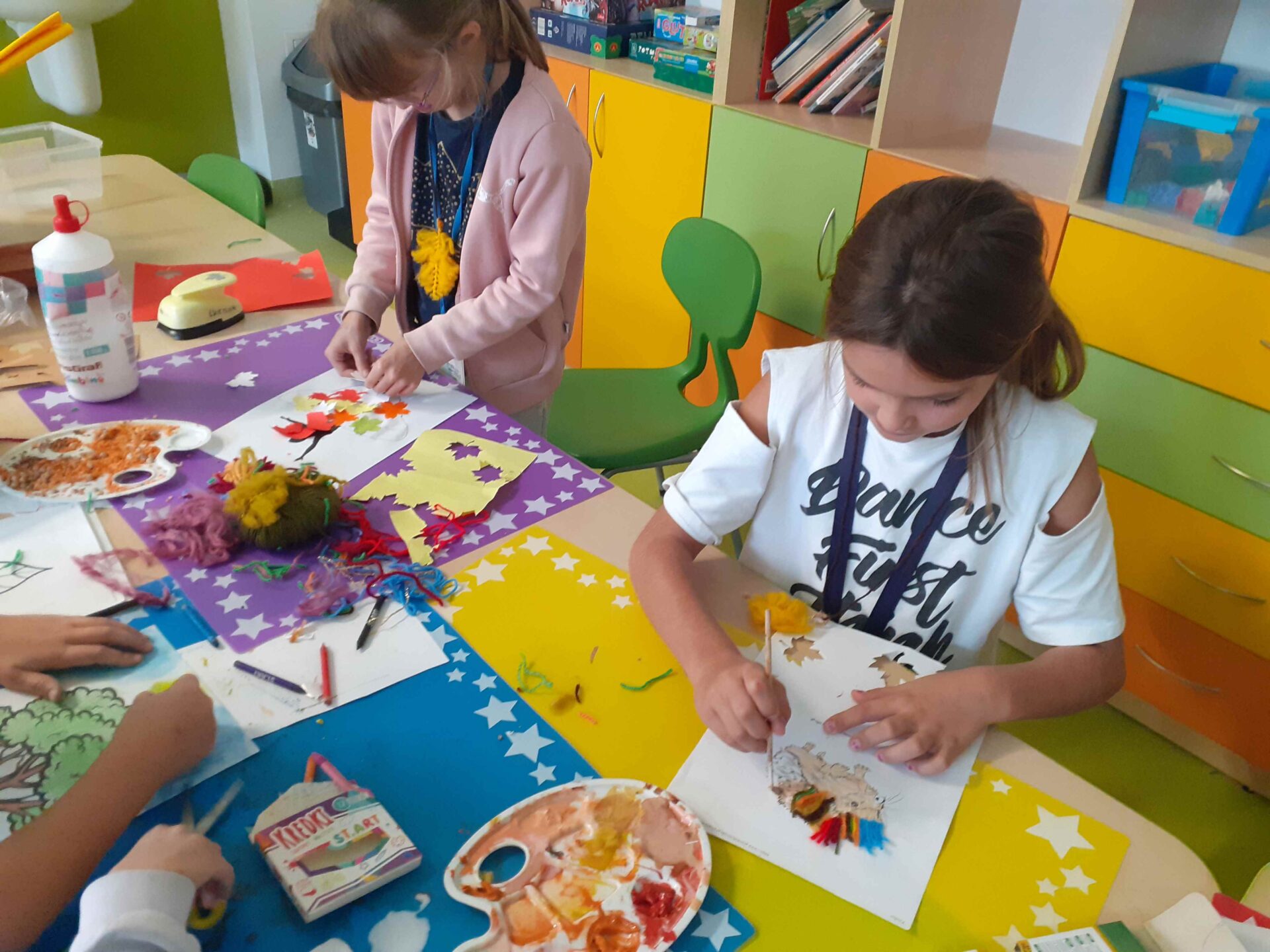 Za oknami feeria barw choć coraz mniej liści, mniej słońca, chłodniejsze i silniejsze podmuchy wiatru. Czuć prawdziwą jesień. Na szczęście w świetlicy atmosfera gorąca. W październik weszliśmy tanecznym krokiem. Mieliśmy przyjemność nauczyć się jednego z tańców pochodzących z regionu Mazowsza. Świetliczaki dowiedziały się więcej o naszej kulturze ludowej. Tworzyły również kolorowe wycinanki łowickie. Wśród prac plastycznych powstałych na początku jesieni wymienić można przygotowane przez uczniów drugich klas papierowe jabłuszka z robaczkami, które dumnie zawisły na drzewie zrobionym z papieru i krepiny. Bardzo ciekawy efekt przyniosło rozmieszczanie przez dzieci kawałków włóczki na konturach wydrukowanych darów jesieni – m.in. grzybów, żołędzi, jabłek, gruszek oraz kolorowanie całości. Jesienne drzewa pojawiły się na szarych talerzach – ich listki wycięte z kolorowego papieru mieniły się ciepłymi barwami. Natomiast drzewa pokryte farbą przez uczniów pierwszych klas zachwyciły swoją różnorodnością. W jednej z sal świetlicowych zawisły żołędzie zrobione ze styropianowych jaj pomalowanych na brązowo oraz ze sznurka, z którego uformowane zostały żołędziowe czapeczki. Również dzieci z trzecich i czwartych klas świetnie bawiły się przy tworzeniu Pani Jesieni, której kształt odwzorowywały na podstawie sylwetki jednej z uczennic. Jej suknię pokryły liście wycięte z kolorowego papieru, a włosy powstały ze sztucznego siana.