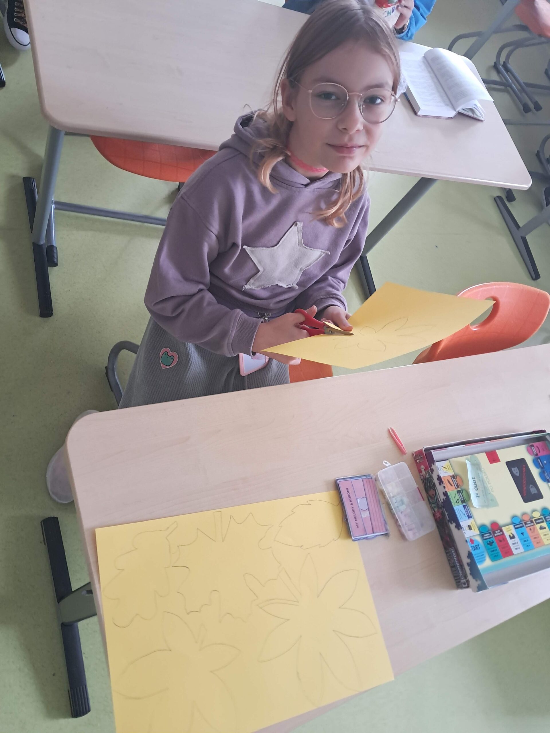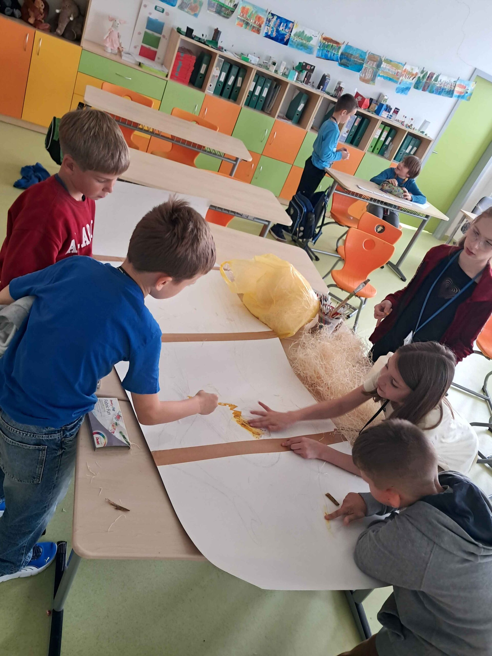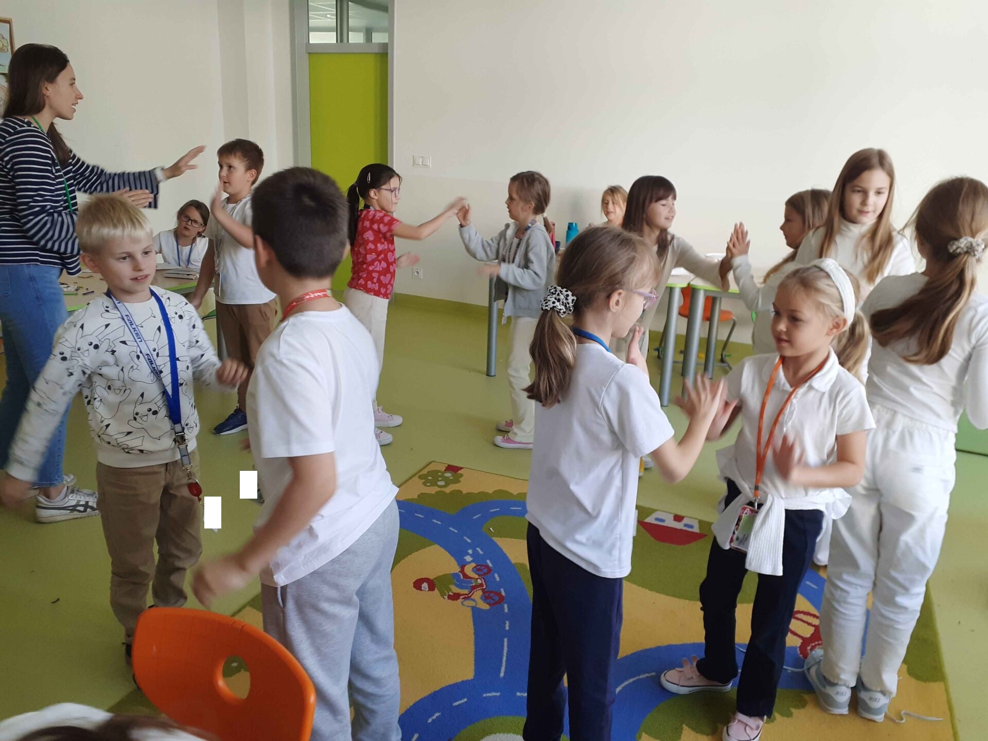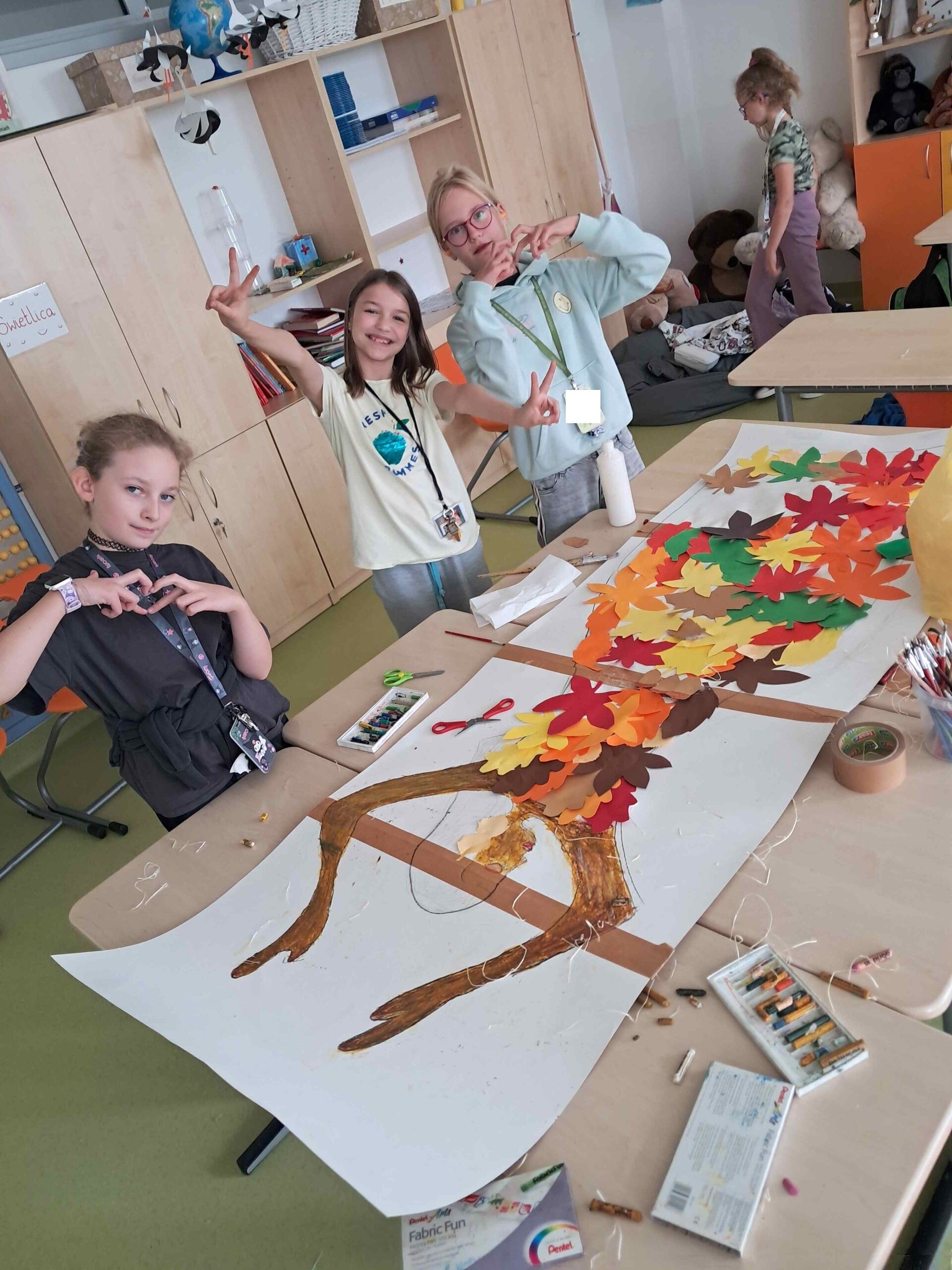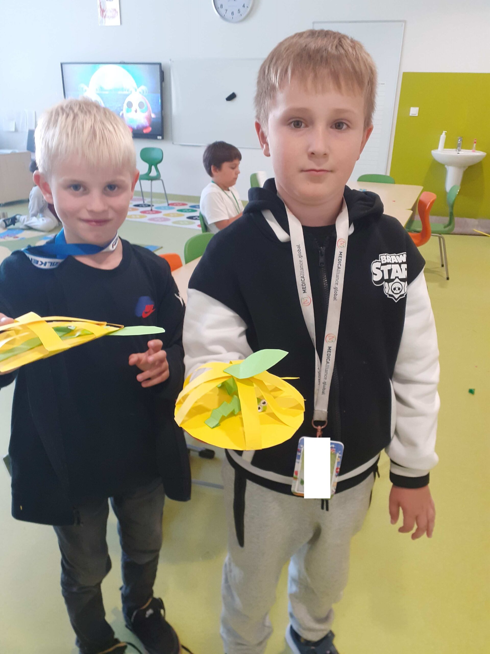 Za oknami feeria barw choć coraz mniej liści, mniej słońca, chłodniejsze i silniejsze podmuchy wiatru. Czuć prawdziwą jesień. Na szczęście w świetlicy atmosfera gorąca. W październik weszliśmy tanecznym krokiem. Mieliśmy przyjemność nauczyć się jednego z tańców pochodzących z regionu Mazowsza. Świetliczaki dowiedziały się więcej o naszej kulturze ludowej. Tworzyły również kolorowe wycinanki łowickie. Wśród prac plastycznych powstałych na początku jesieni wymienić można przygotowane przez uczniów drugich klas papierowe jabłuszka z robaczkami, które dumnie zawisły na drzewie zrobionym z papieru i krepiny. Bardzo ciekawy efekt przyniosło rozmieszczanie przez dzieci kawałków włóczki na konturach wydrukowanych darów jesieni – m.in. grzybów, żołędzi, jabłek, gruszek oraz kolorowanie całości. Jesienne drzewa pojawiły się na szarych talerzach – ich listki wycięte z kolorowego papieru mieniły się ciepłymi barwami. Natomiast drzewa pokryte farbą przez uczniów pierwszych klas zachwyciły swoją różnorodnością. W jednej z sal świetlicowych zawisły żołędzie zrobione ze styropianowych jaj pomalowanych na brązowo oraz ze sznurka, z którego uformowane zostały żołędziowe czapeczki. Również dzieci z trzecich i czwartych klas świetnie bawiły się przy tworzeniu Pani Jesieni, której kształt odwzorowywały na podstawie sylwetki jednej z uczennic. Jej suknię pokryły liście wycięte z kolorowego papieru, a włosy powstały ze sztucznego siana.