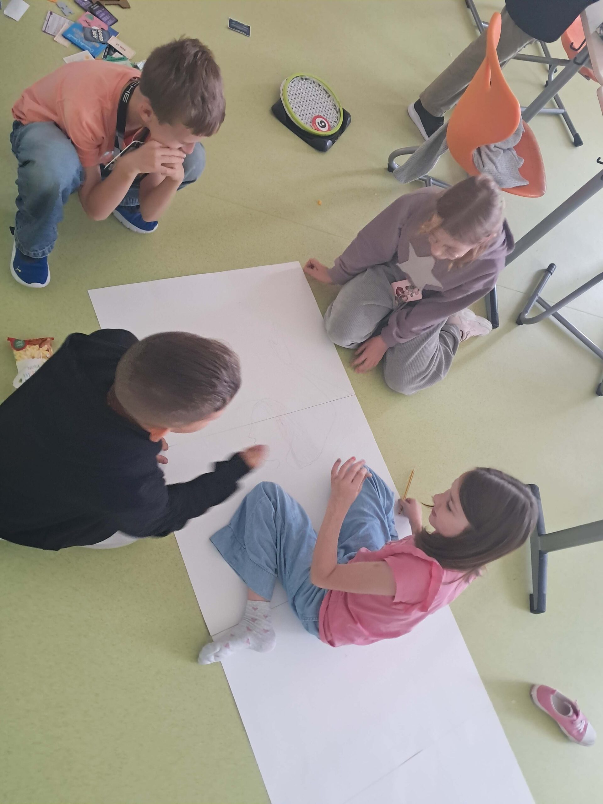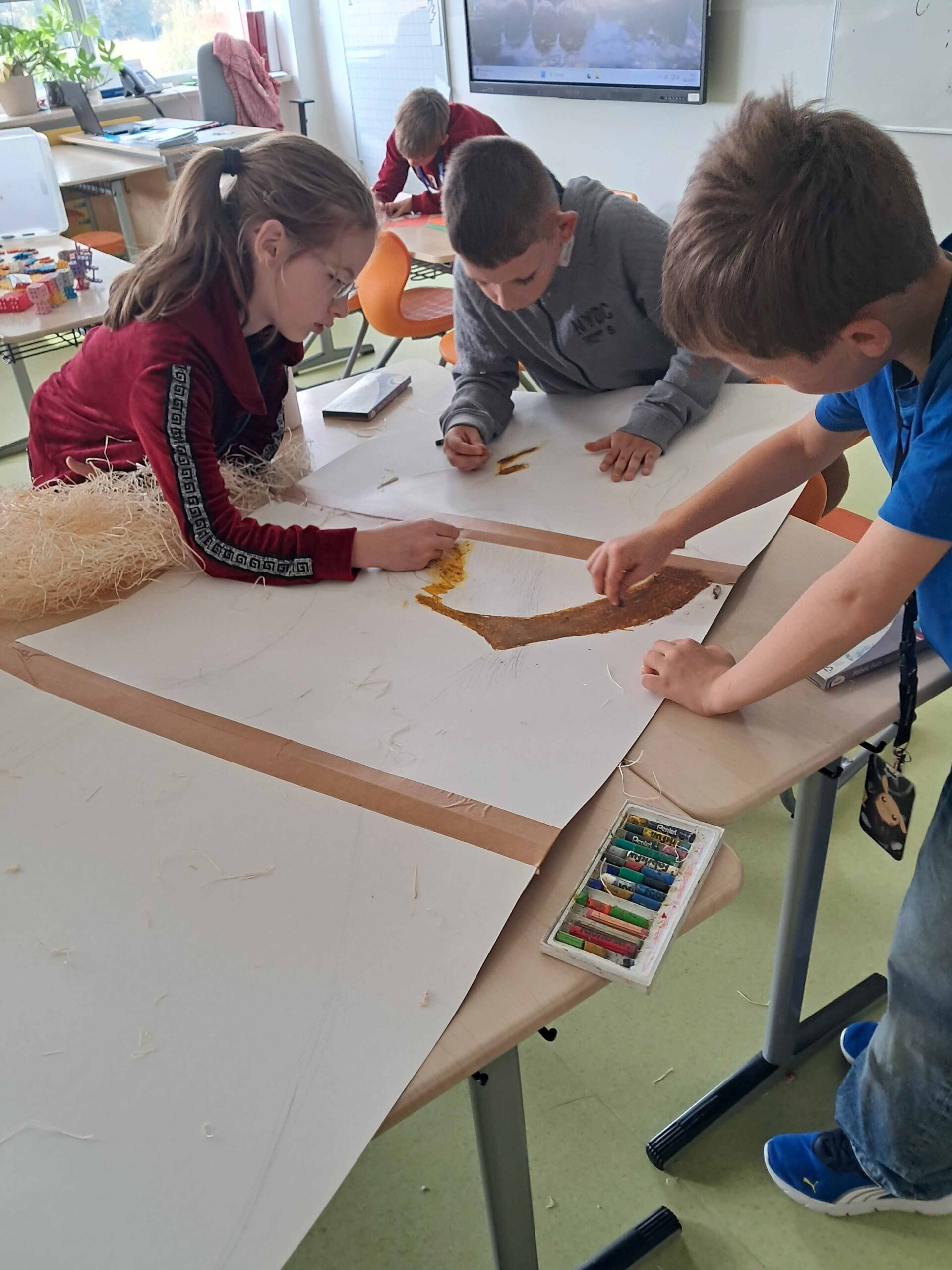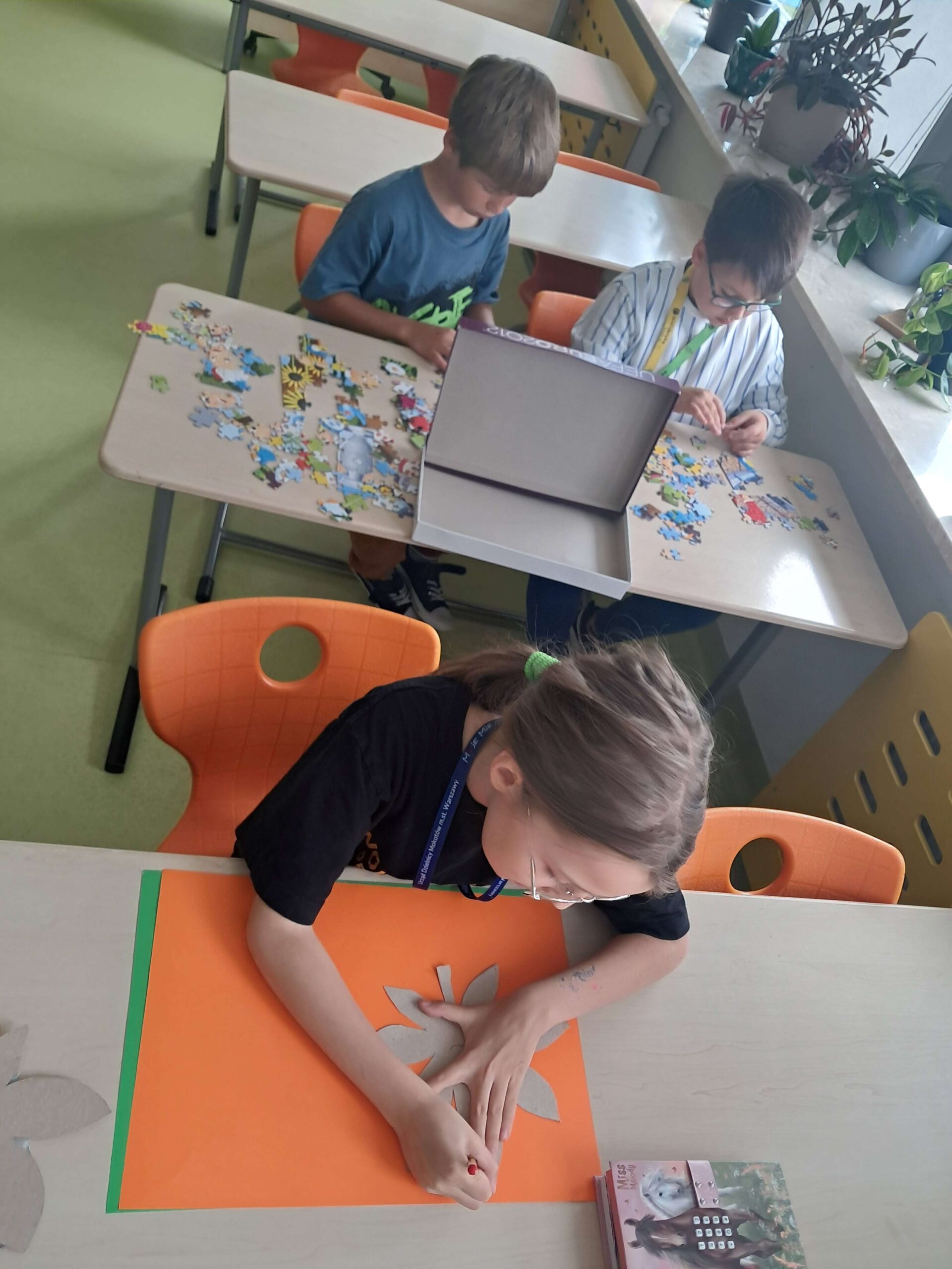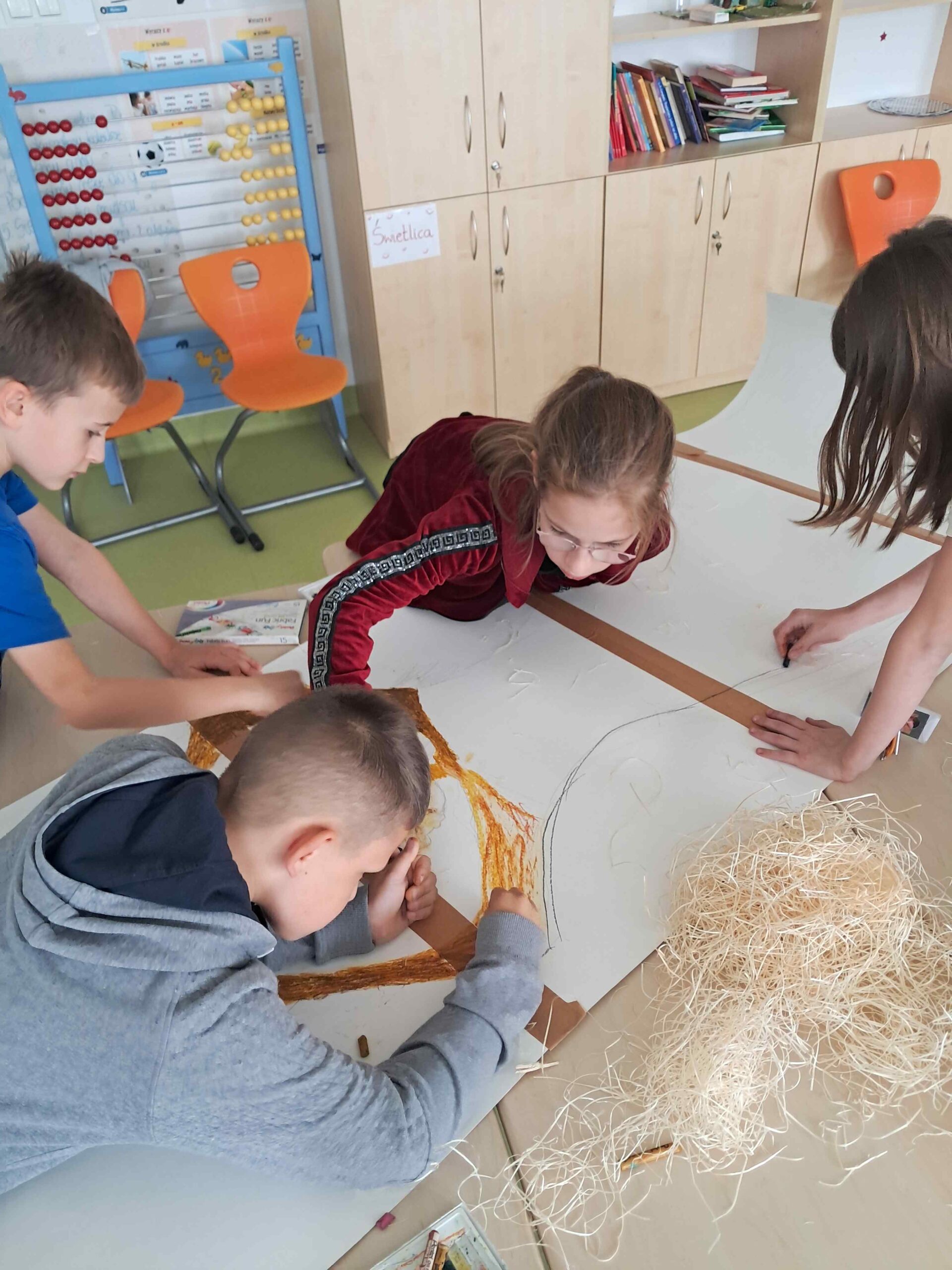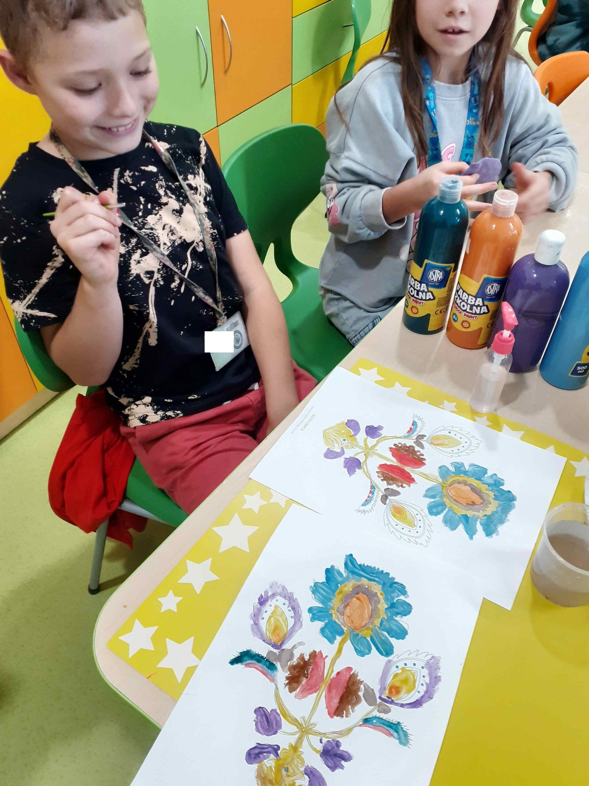 Za oknami feeria barw choć coraz mniej liści, mniej słońca, chłodniejsze i silniejsze podmuchy wiatru. Czuć prawdziwą jesień. Na szczęście w świetlicy atmosfera gorąca. W październik weszliśmy tanecznym krokiem. Mieliśmy przyjemność nauczyć się jednego z tańców pochodzących z regionu Mazowsza. Świetliczaki dowiedziały się więcej o naszej kulturze ludowej. Tworzyły również kolorowe wycinanki łowickie. Wśród prac plastycznych powstałych na początku jesieni wymienić można przygotowane przez uczniów drugich klas papierowe jabłuszka z robaczkami, które dumnie zawisły na drzewie zrobionym z papieru i krepiny. Bardzo ciekawy efekt przyniosło rozmieszczanie przez dzieci kawałków włóczki na konturach wydrukowanych darów jesieni – m.in. grzybów, żołędzi, jabłek, gruszek oraz kolorowanie całości. Jesienne drzewa pojawiły się na szarych talerzach – ich listki wycięte z kolorowego papieru mieniły się ciepłymi barwami. Natomiast drzewa pokryte farbą przez uczniów pierwszych klas zachwyciły swoją różnorodnością. W jednej z sal świetlicowych zawisły żołędzie zrobione ze styropianowych jaj pomalowanych na brązowo oraz ze sznurka, z którego uformowane zostały żołędziowe czapeczki. Również dzieci z trzecich i czwartych klas świetnie bawiły się przy tworzeniu Pani Jesieni, której kształt odwzorowywały na podstawie sylwetki jednej z uczennic. Jej suknię pokryły liście wycięte z kolorowego papieru, a włosy powstały ze sztucznego siana.