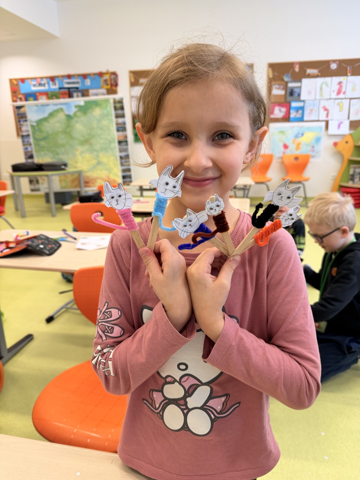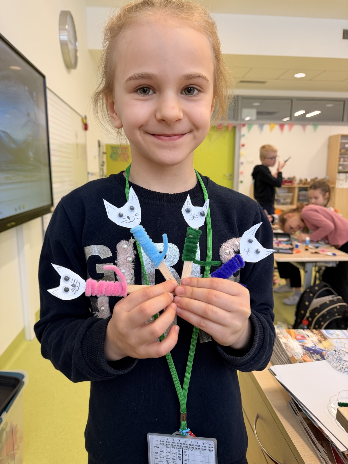 Świętowaliśmy również Dzień Kota – rozmawialiśmy o tym, jak dbać o naszych mruczących przyjaciół, a kreatywność uczniów zaowocowała wspaniałymi kocimi podobiznami.