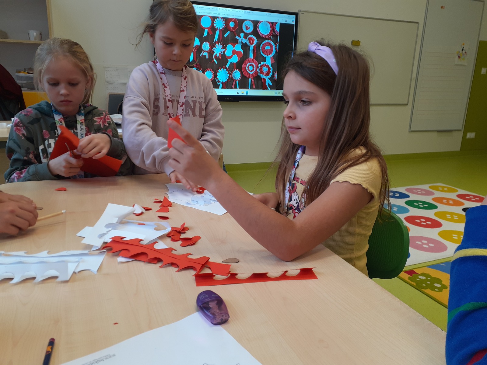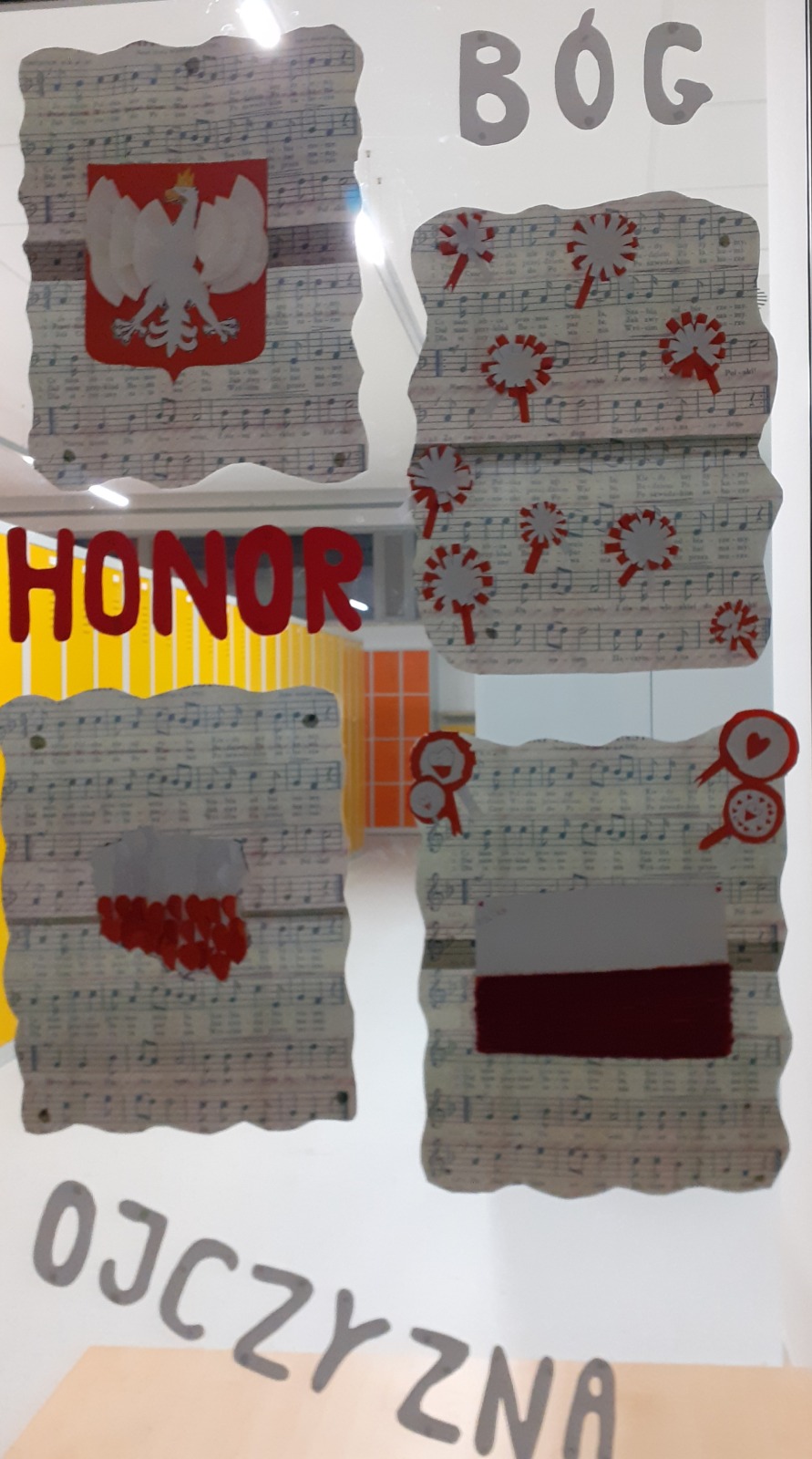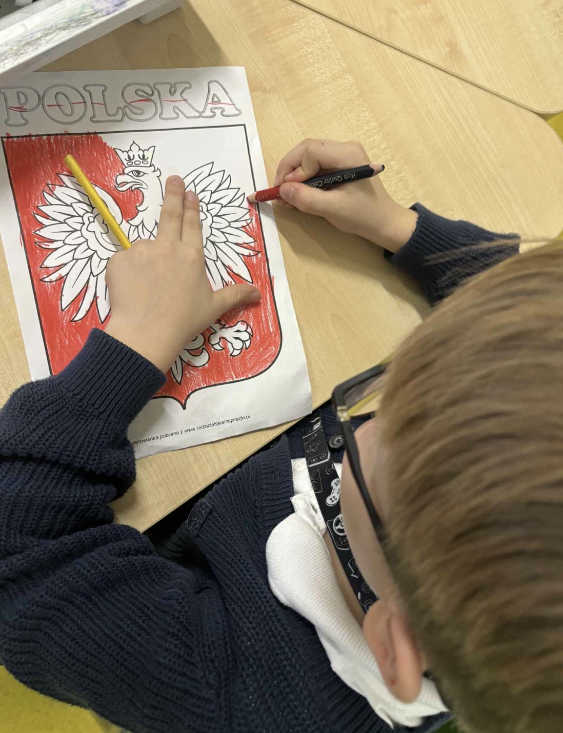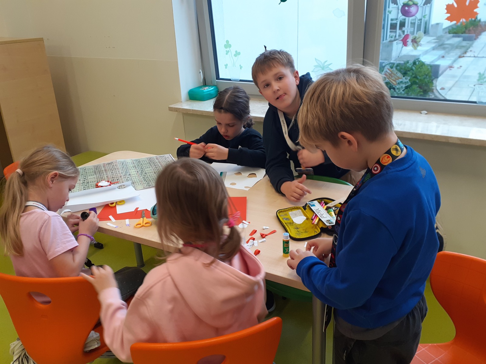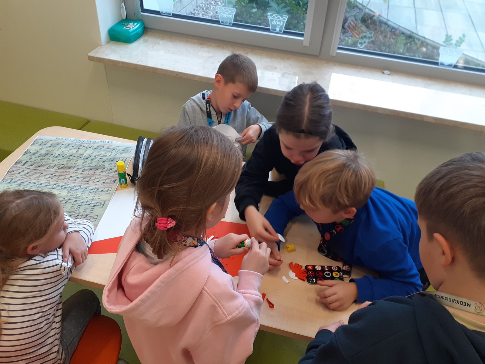 Za nami Uroczystość Wszystkich Świętych wraz z Dniem Zadusznym oraz Narodowe Święto Niepodległości. W świetlicy dzieci z zaangażowaniem uczestniczyły w rozmowach dotyczących sposobów spędzania tego wyjątkowego czasu w ich domach. Chętnie dzieliły się swoimi wspomnieniami o bliskich zmarłych, mając ich w sercu i pamięci. Przygotowały znicze w różnych odsłonach: wycięte z papieru, w formie intensywnie kolorowych witraży a także z rolek papieru ozdobionych sznurkami. Oglądały również filmy edukacyjne pogłębiające ich wiedzę dotyczącą wspomnianych tematów, m.in. materiał poruszający genezę powstania oraz znaczenie Grobu Nieznanego Żołnierza. W ramach kącika czytelniczego zapoznawały się z informacjami o bohaterskich postaciach. Z ochotą wypełniały karty pracy oraz w skupieniu odśpiewały hymn „Mazurek Dąbrowskiego. Drugoklasiści wykazali się imponującą znajomością wydarzeń historycznych związanych z odzyskaniem niepodległości i znaczeń symboli narodowych. Dzieci przygotowały również prace plastyczne przedstawiające orły w koronie. Część drugoklasistów, wykorzystując różne materiały, m.in. wełnę, kolorowy papier, papilotki, kredki, utworzyła trzy plakaty przedstawiające flagę Polski, rozety, biało-czerwone kotyliony, godło Polski oraz mapę Polski, umieszczone na tle wydrukowanych nut polskiego hymnu narodowego.