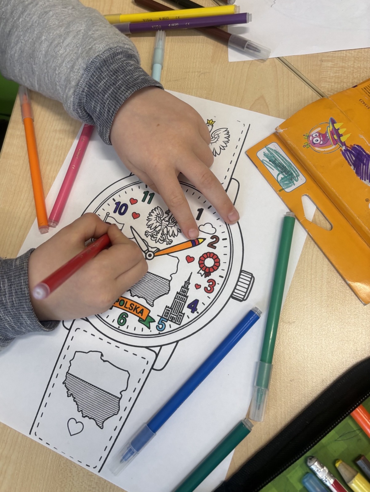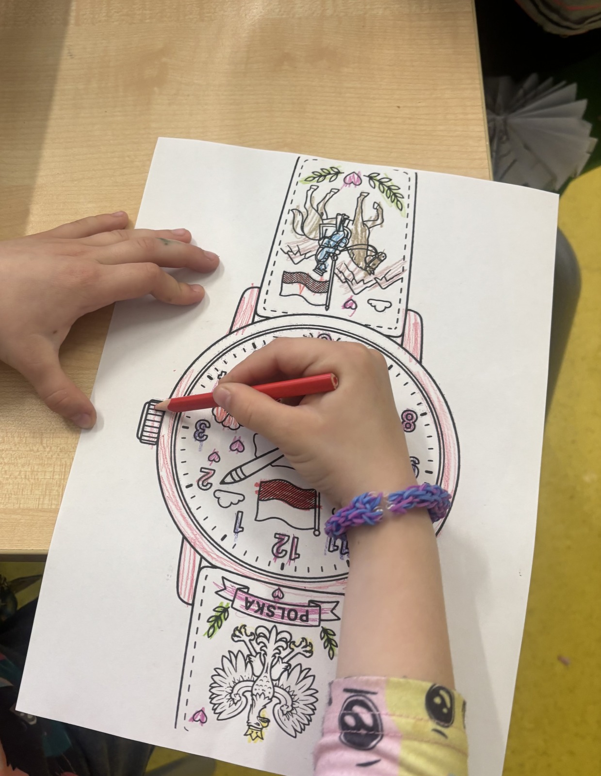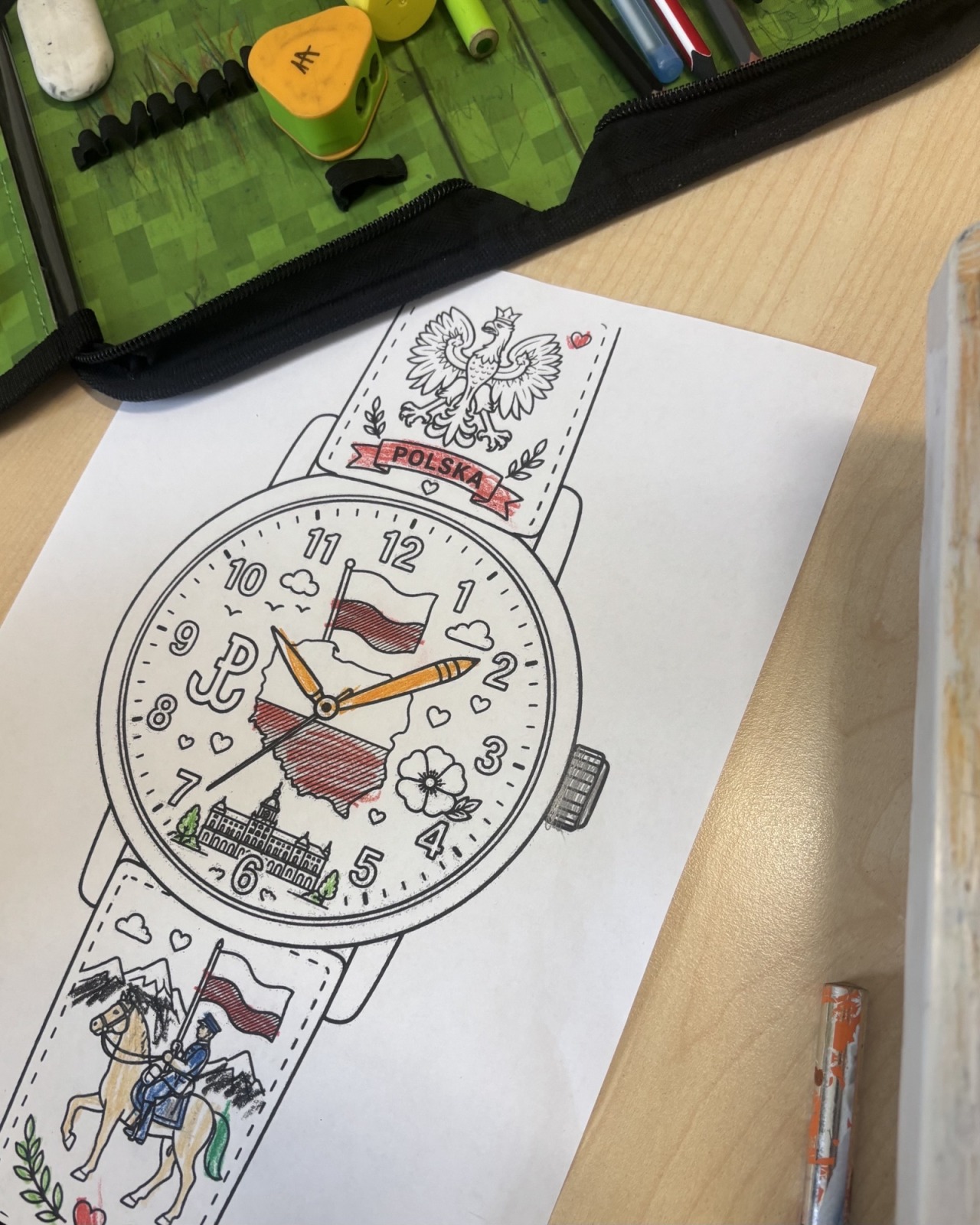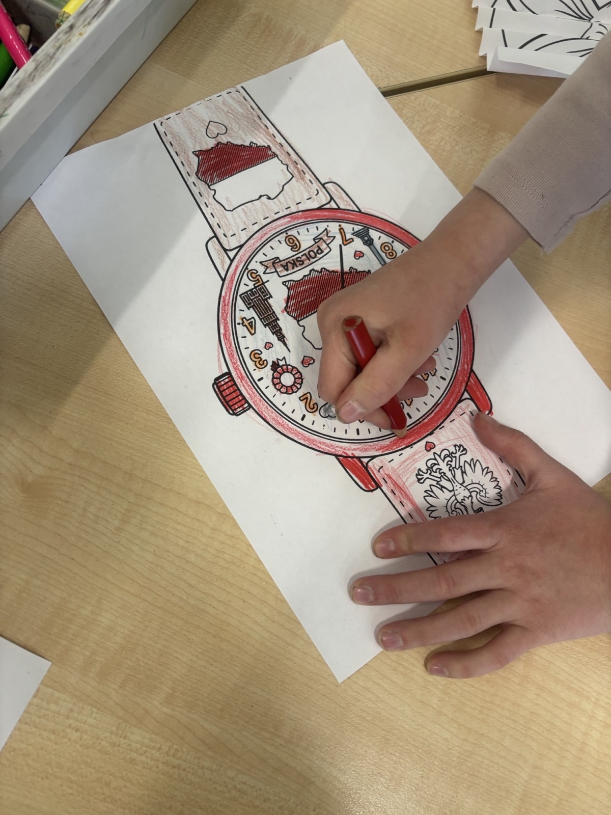 W świetlicy szkolnej uczniowie klas 1a i 1b uczestniczyli w zajęciach patriotycznych, podczas których kolorowali przygotowane szablony zegarków przedstawiających symbole narodowe Polski. Na pracach pojawiły się m.in. flaga, godło oraz inne charakterystyczne elementy związane z naszym krajem. Podczas zajęć dzieci utrwalały znajomość barw narodowych, rozwijały postawy patriotyczne oraz doskonaliły sprawność manualną i kreatywność.