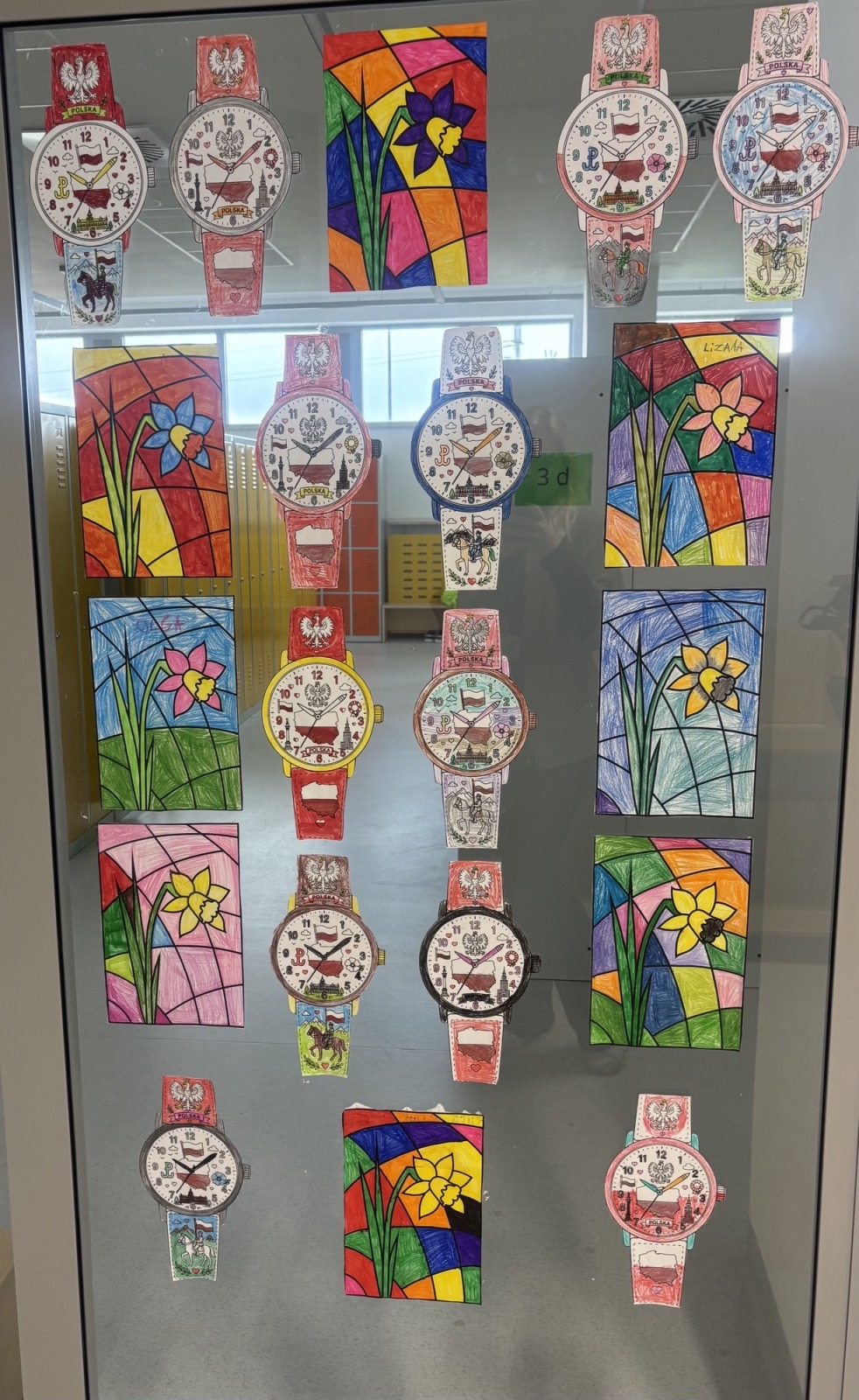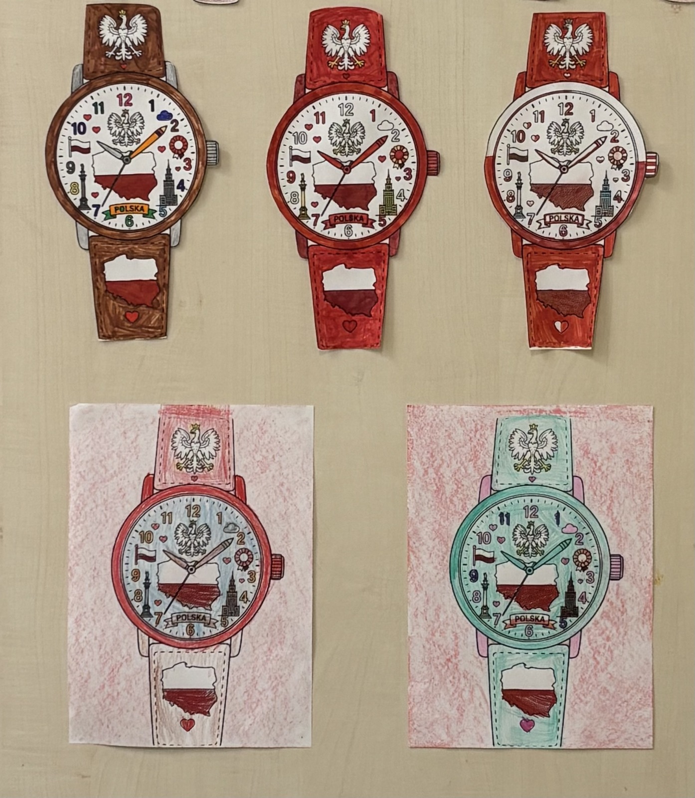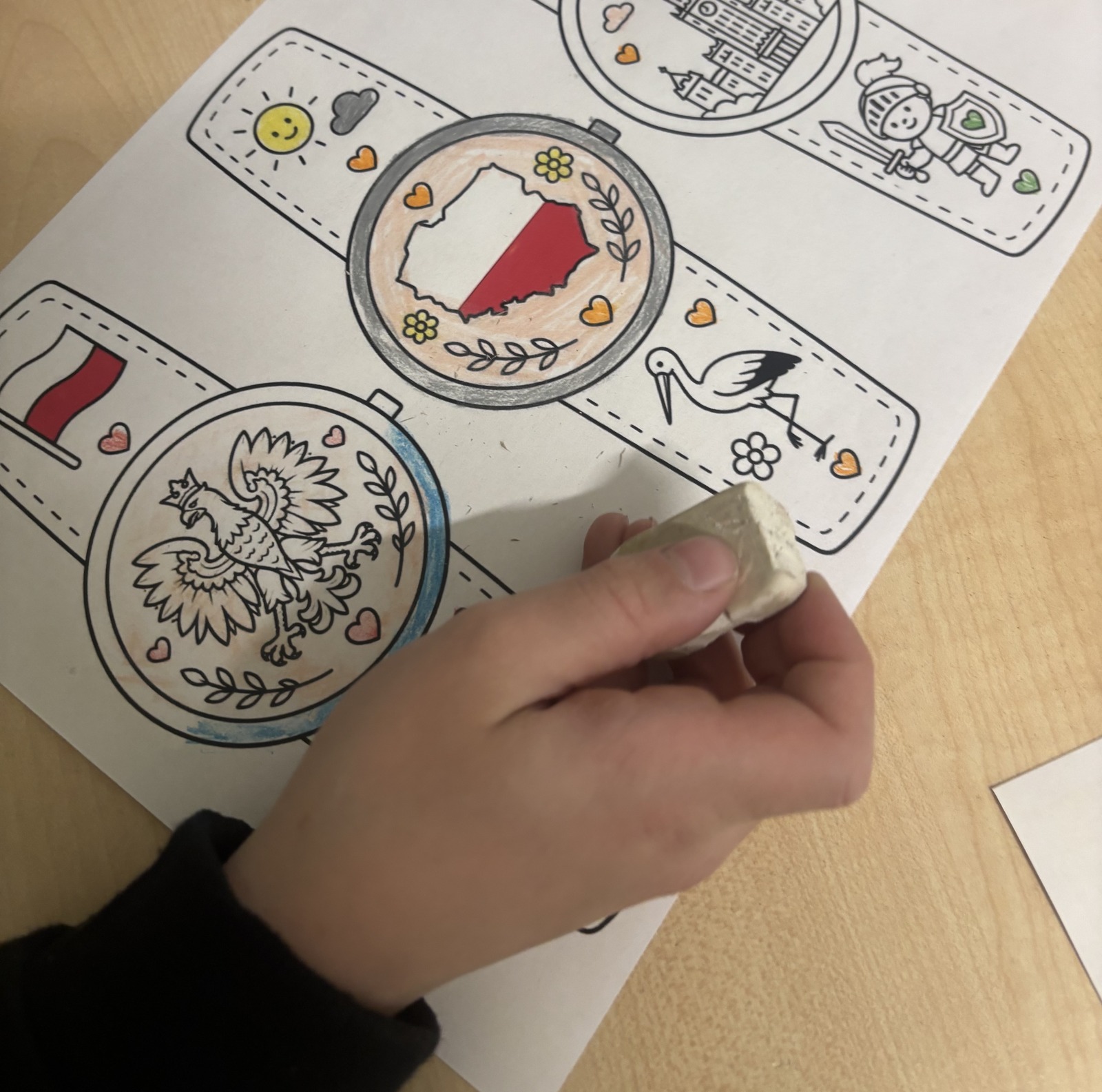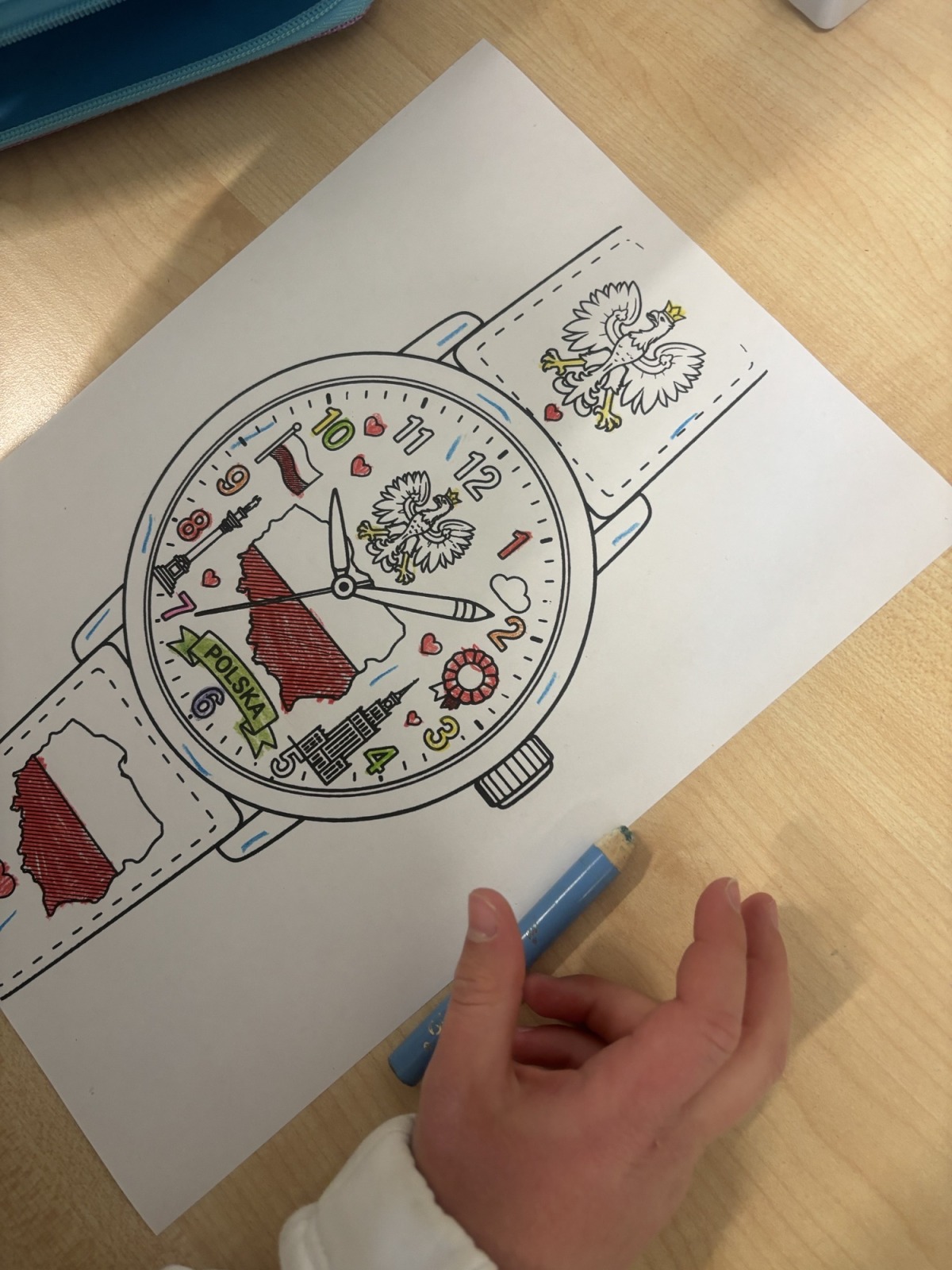 W świetlicy szkolnej uczniowie klas 1a i 1b uczestniczyli w zajęciach patriotycznych, podczas których kolorowali przygotowane szablony zegarków przedstawiających symbole narodowe Polski. Na pracach pojawiły się m.in. flaga, godło oraz inne charakterystyczne elementy związane z naszym krajem. Podczas zajęć dzieci utrwalały znajomość barw narodowych, rozwijały postawy patriotyczne oraz doskonaliły sprawność manualną i kreatywność.